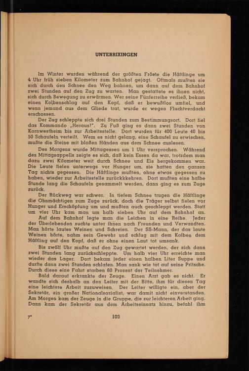 Im Winter wurden während der größten Fröste die Häftlinge um 4 Uhr früh sieben Kilometer zum Bahnhof gejagt. Oftmals mußten sie sich durch den Schnee den Weg bahnen, um dann auf dem Bahnhof zwei Stunden auf den Zug zu warten. Man gestattete es ihnen nicht, sich durch Bewegung zu erwärmen. Wer seine Fünferreihe verließ, bekam einen Kolbenschlag auf den Kopf, daß er bewußtlos umfiel, und wenn jemand aus dem Gliede trat, wurde er wegen Fluchtverdacht erschossen.