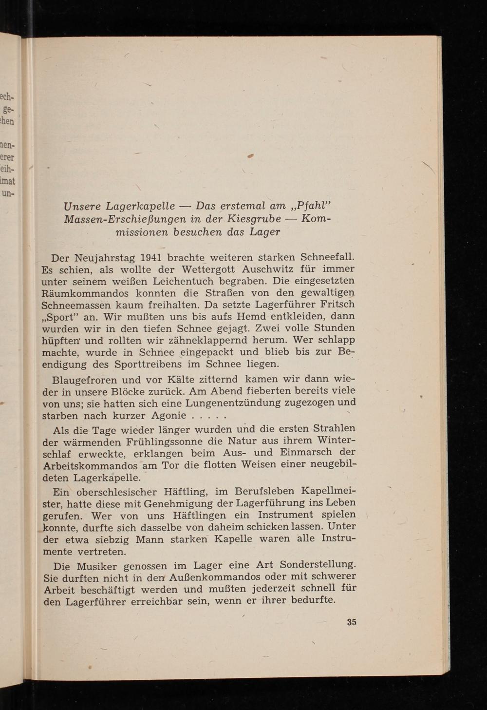 Der Neujahrstag 1941 brachte weiteren starken Schneefall. Es schien, als wollte der Wettergott Auschwitz für immer unter seinem weißen Leichentuch begraben. Die eingesetzten Räumkommandos konnten die Straßen von den gewaltigen Schneemassen kaum freihalten. Da setzte Lagerführer Fritsch ,, Sport " an. Wir mußten uns bis aufs Hemd entkleiden, dann wurden wir in den tiefen Schnee gejagt. Zwei volle Stunden hüpften und rollten wir zähneklappernd herum. Wer schlapp machte, wurde in Schnee eingepackt und blieb bis zur Beendigung des Sporttreibens im Schnee liegen.
