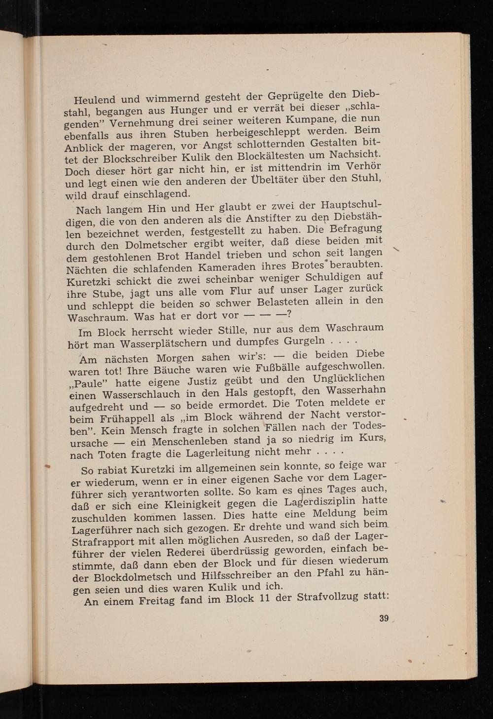 Heulend und wimmernd gesteht der Geprügelte den Diebstahl, begangen aus Hunger und er verrät bei dieser ,, schlagenden" Vernehmung drei seiner weiteren Kumpane, die nun ebenfalls aus ihren Stuben herbeigeschleppt werden. Beim Anblick der mageren, vor Angst schlotternden Gestalten bittet der Blockschreiber Kulik den Blockältesten um Nachsicht. Doch dieser hört gar nicht hin, er ist mittendrin im Verhör und legt einen wie den anderen der Übeltäter über den Stuhl, wild drauf einschlagend.