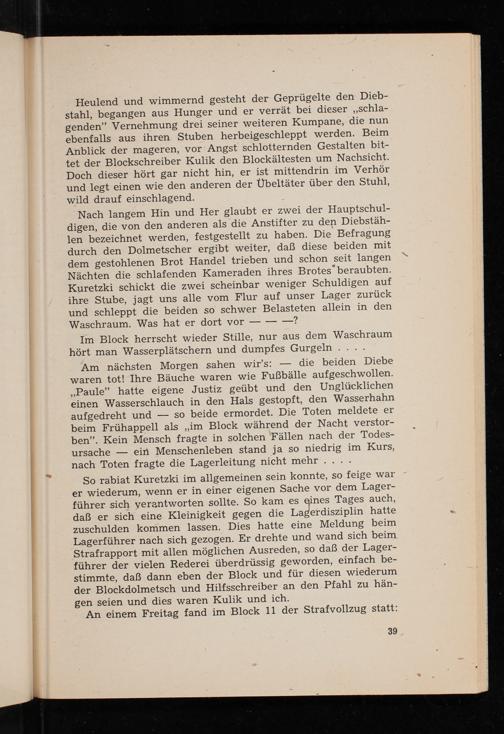 Im Block herrscht wieder Stille, nur aus dem Waschraum hört man Wasserplätschern und dumpfes Gurgeln.... die beiden Diebe Am nächsten Morgen sahen wir's: waren tot! Ihre Bäuche waren wie Fußbälle aufgeschwollen. ,, Paule" hatte eigene Justiz geübt und den Unglücklichen einen Wasserschlauch in den Hals gestopft, den Wasserhahn aufgedreht und so beide ermordet. Die Toten meldete er beim Frühappell als ,, im Block während der Nacht verstorben". Kein Mensch fragte in solchen Fällen nach der Todesursache ein Menschenleben stand ja so niedrig im Kurs, nach Toten fragte die Lagerleitung nicht mehr....