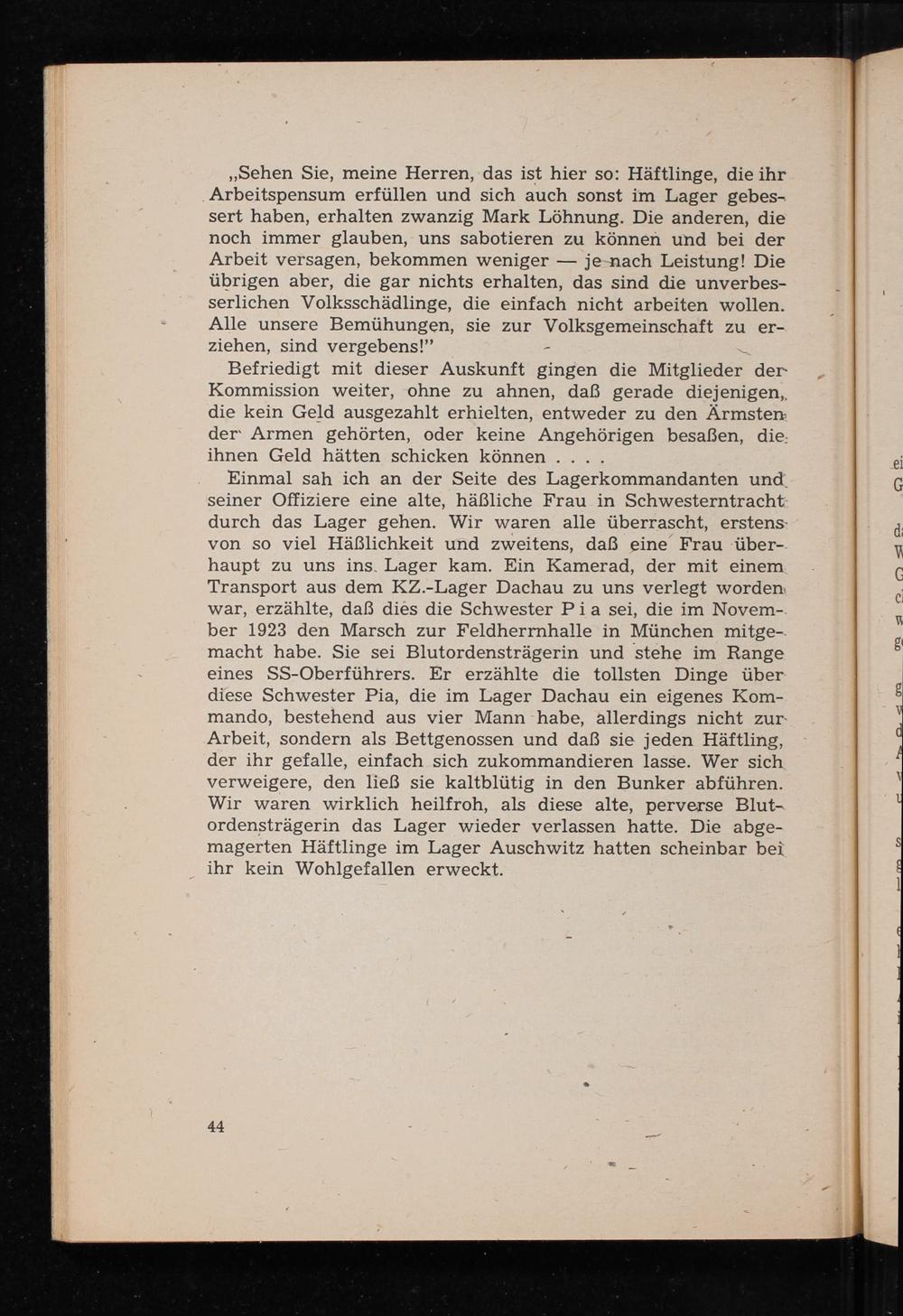 Einmal sah ich an der Seite des Lagerkommandanten und seiner Offiziere eine alte, häßliche Frau in Schwesterntracht durch das Lager gehen. Wir waren alle überrascht, erstens von so viel Häßlichkeit und zweitens, daß eine Frau überhaupt zu uns ins. Lager kam. Ein Kamerad, der mit einem Transport aus dem KZ.- Lager Dachau zu uns verlegt worden war, erzählte, daß dies die Schwester Pia sei, die im November 1923 den Marsch zur Feldherrnhalle in München mitgemacht habe. Sie sei Blutordensträgerin und stehe im Range eines SS- Oberführers. Er erzählte die tollsten Dinge über diese Schwester Pia, die im Lager Dachau ein eigenes Kommando, bestehend aus vier Mann habe, allerdings nicht zur Arbeit, sondern als Bettgenossen und daß sie jeden Häftling, der ihr gefalle, einfach sich zukommandieren lasse. Wer sich verweigere, den ließ sie kaltblütig in den Bunker abführen. Wir waren wirklich heilfroh, als diese alte, perverse Blutordensträgerin das Lager wieder verlassen hatte. Die abgemagerten Häftlinge im Lager Auschwitz hatten scheinbar bei ihr kein Wohlgefallen erweckt.