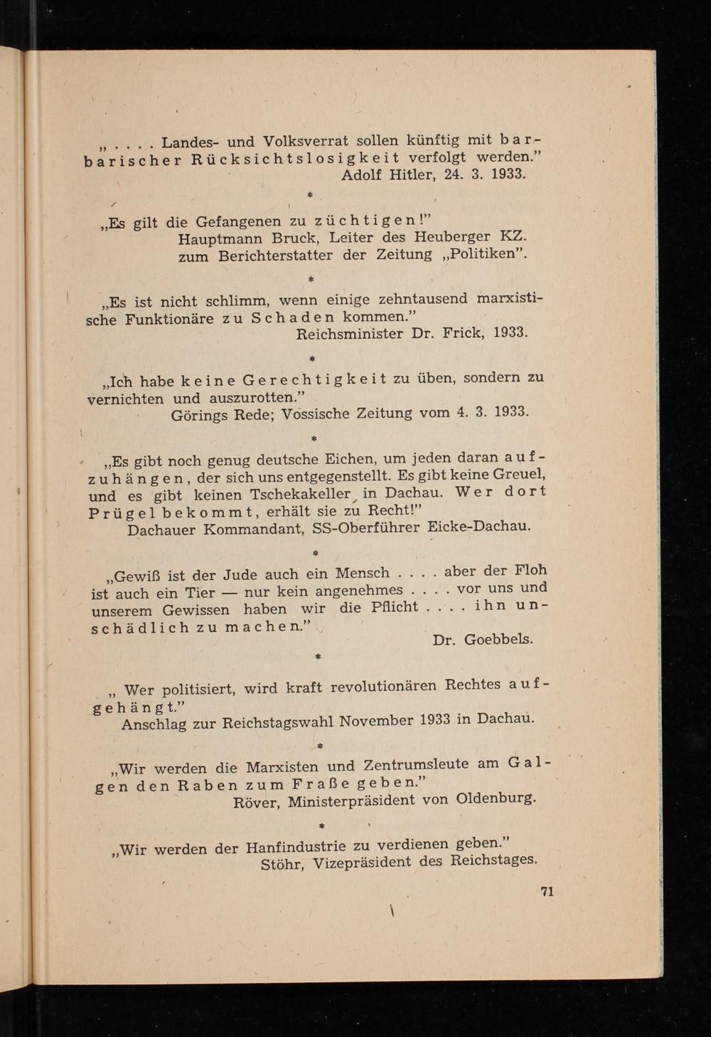 „we... Landes- und Volksverrat sollen künftig mit bar- barischer Rücksichtslosigkeit verfolgt werden.” Adolf Hitler , 24. 3. 1933.