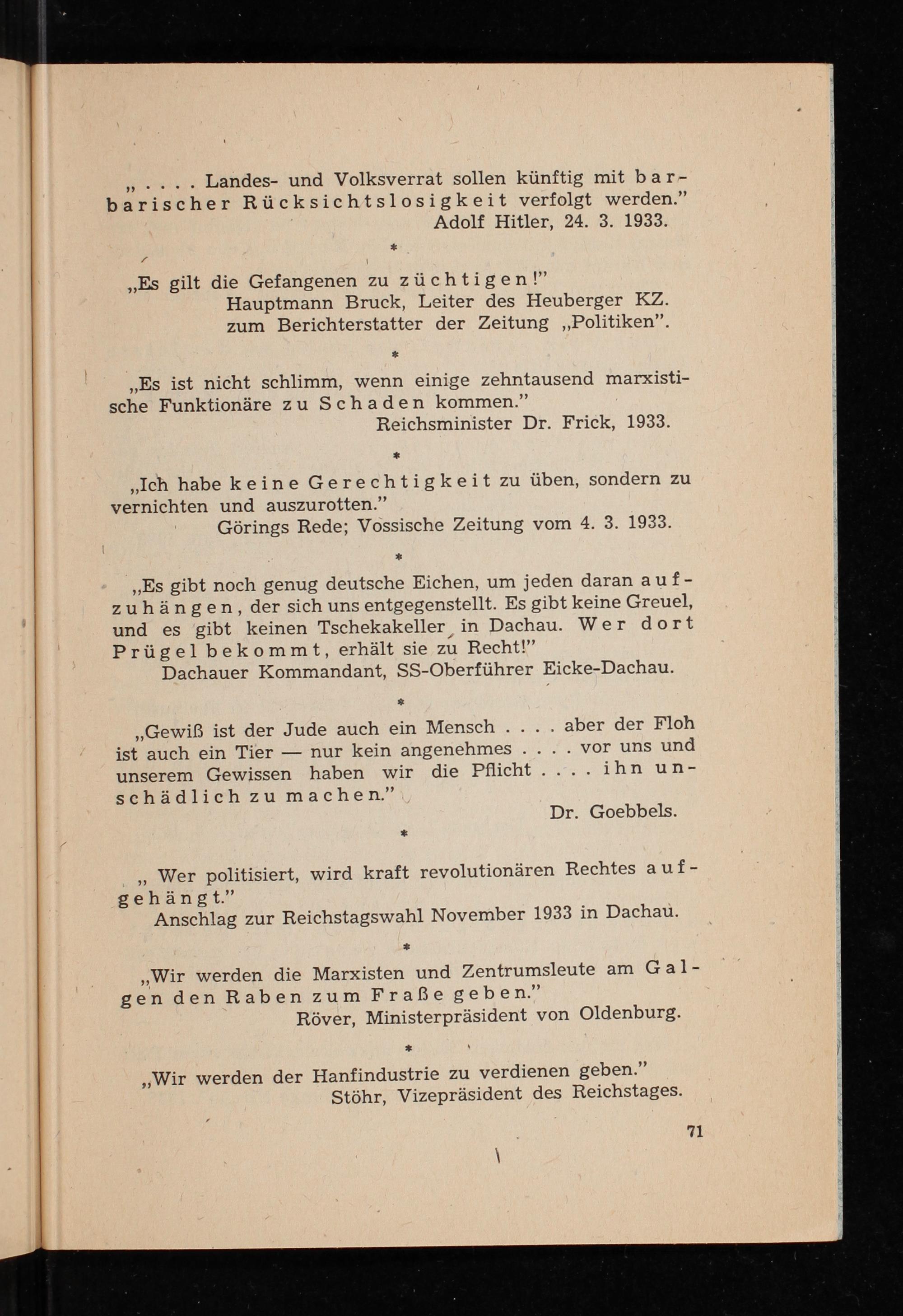 „Es gibt noch genug deutsche Eichen, um jeden daran auf- zuhängen, der sich uns entgegenstellt. Es gibt keine Greuel, und es gibt keinen Tschekakeller in Dachau . Wer dort Prügelbekommt, erhält sie zu Recht!”