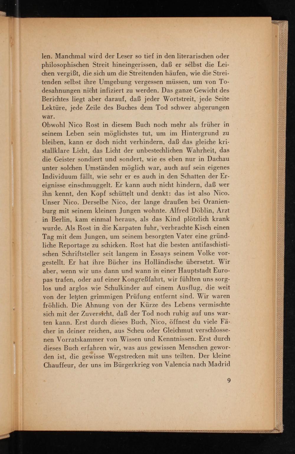 Obwohl Nico Rost in diesem Buch noch mehr als früher in seinem Leben sein möglichstes tut, um im Hintergrund zu bleiben, kann er doch nicht verhindern, daß das gleiche kristallklare Licht, das Licht der unbestechlichen Wahrheit, das die Geister sondiert und sondert, wie es eben nur in Dachau unter solchen Umständen möglich war, auch auf sein eigenes Individuum fällt, wie sehr er es auch in den Schatten der Ereignisse einschmuggelt. Er kann auch nicht hindern, daß wer ihn kennt, den Kopf schüttelt und denkt: das ist also Nico. Unser Nico. Derselbe Nico, der lange draußen bei Oranienburg mit seinem kleinen Jungen wohnte. Alfred Döblin , Arzt in Berlin , kam einmal heraus, als das Kind plötzlich krank wurde. Als Rost in die Karpaten fuhr, verbrachte Kisch einen Tag mit dem Jungen, um seinem besorgten Vater eine gründliche Reportage zu schicken. Rost hat die besten antifaschistischen Schriftsteller seit langem in Essays seinem Volke vorgestellt. Er hat ihre Bücher ins Holländische übersetzt. Wir aber, wenn wir uns dann und wann in einer Hauptstadt Europas trafen, oder auf einer Kongreßfahrt, wir fühlten uns sorglos und arglos wie Schulkinder auf einem Ausflug, die weit von der letzten grimmigen Prüfung entfernt sind. Wir waren fröhlich. Die Ahnung von der Kürze des Lebens vermischte sich mit der Zuversicht, daß der Tod noch ruhig auf uns warten kann. Erst durch dieses Buch, Nico, öffnest du viele Fächer in deiner reichen, aus Scheu oder Gleichmut verschlossenen Vorratskammer von Wissen und Kenntnissen. Erst durch dieses Buch erfahren wir, was aus gewissen Menschen geworden ist, die gewisse Wegstrecken mit uns teilten. Der kleine Chauffeur, der uns im Bürgerkrieg von Valencia nach Madrid