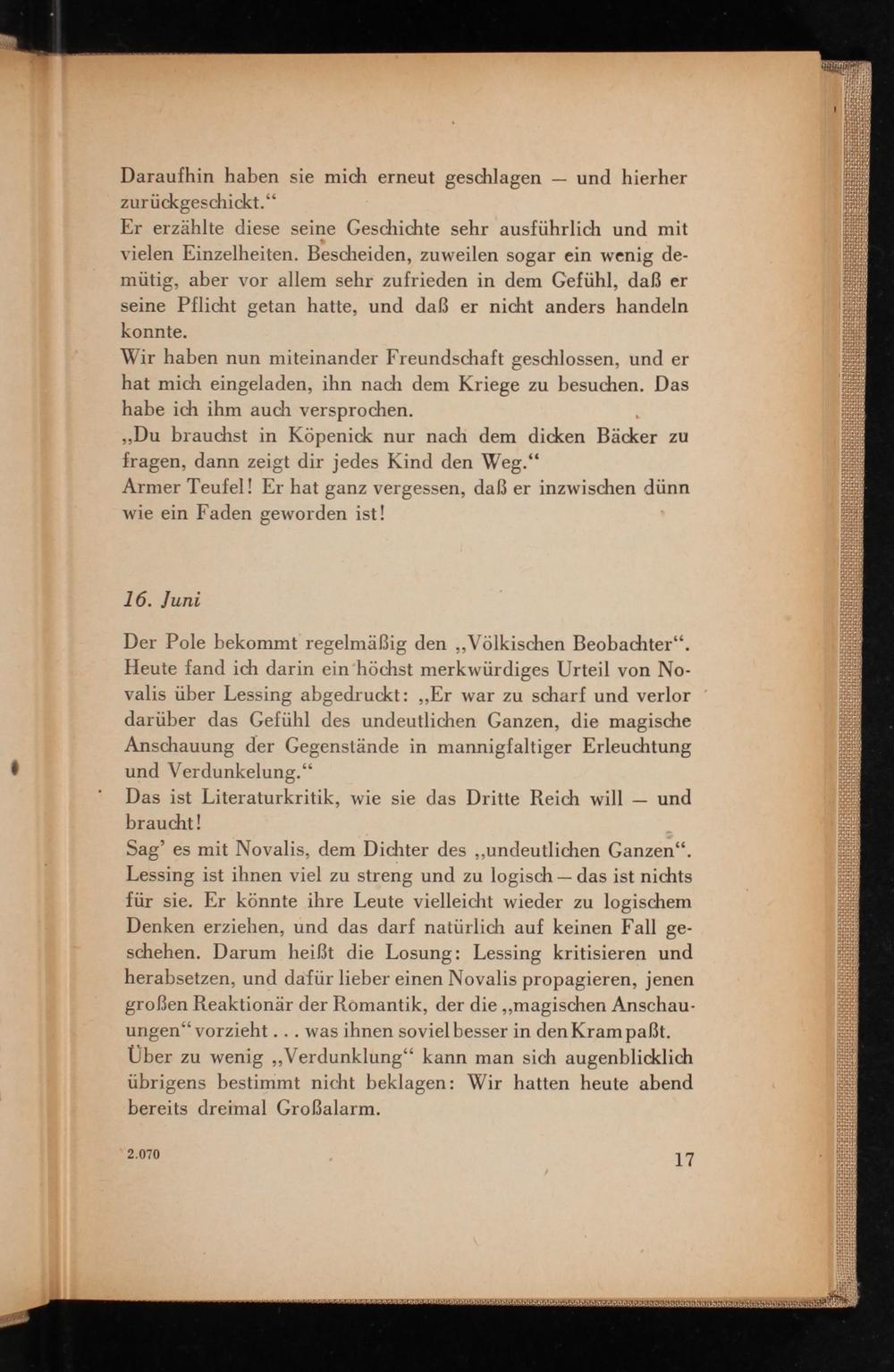Der Pole bekommt regelmäßig den ,, Völkischen Beobachter". Heute fand ich darin ein höchst merkwürdiges Urteil von No­valis über Lessing abgedruckt: ,, Er war zu scharf und verlor darüber das Gefühl des undeutlichen Ganzen, die magische Anschauung der Gegenstände in mannigfaltiger Erleuchtung und Verdunkelung."