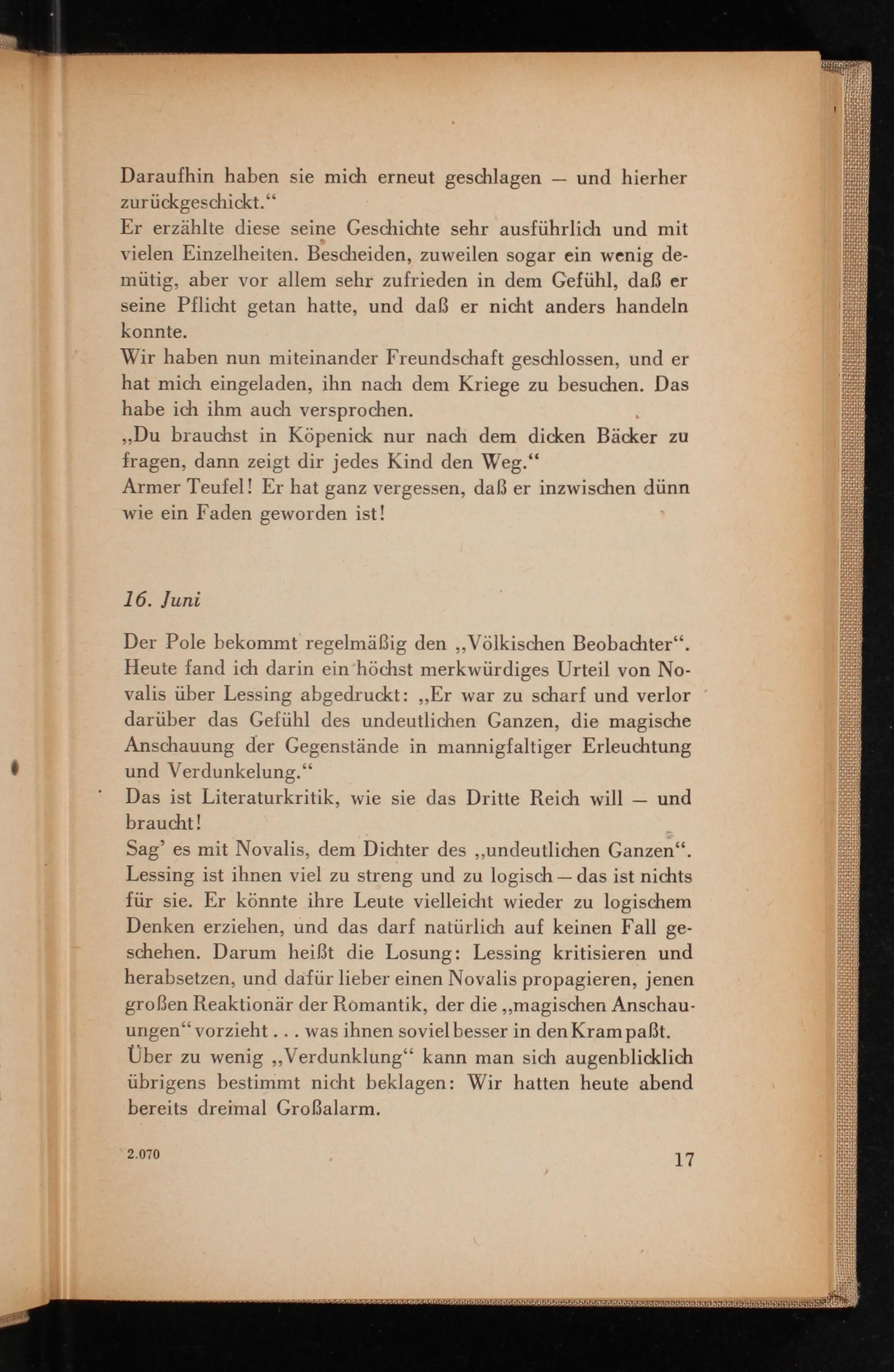 Der Pole bekommt regelmäßig den ,, Völkischen Beobachter". Heute fand ich darin ein höchst merkwürdiges Urteil von Novalis über Lessing abgedruckt: ,, Er war zu scharf und verlor darüber das Gefühl des undeutlichen Ganzen, die magische Anschauung der Gegenstände in mannigfaltiger Erleuchtung und Verdunkelung."