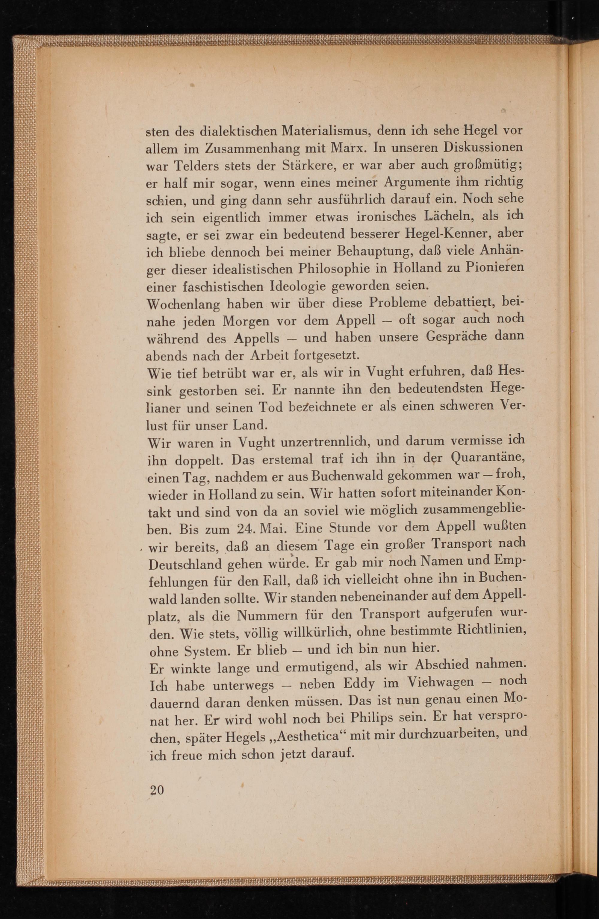 sten des dialektischen Materialismus, denn ich sehe Hegel vor allem im Zusammenhang mit Marx. In unseren Diskussionen war Telders stets der Stärkere, er war aber auch großmütig; er half mir sogar, wenn eines meiner Argumente ihm richtig schien, und ging dann sehr ausführlich darauf ein. Noch sehe ich sein eigentlich immer etwas ironisches Lächeln, als ich sagte, er sei zwar ein bedeutend besserer Hegel - Kenner, aber ich bliebe dennoch bei meiner Behauptung, daß viele Anhänger dieser idealistischen Philosophie in Holland zu Pionieren einer faschistischen Ideologie geworden seien. Wochenlang haben wir über diese Probleme debattiert, beinahe jeden Morgen vor dem Appell- oft sogar auch noch während des Appells- und haben unsere Gespräche dann abends nach der Arbeit fortgesetzt.