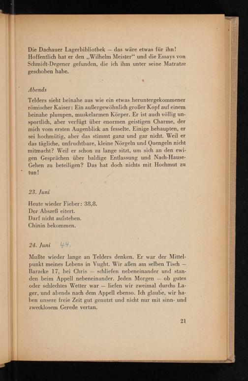 Die Dachauer Lagerbibliothek- das wäre etwas für ihn! Hoffentlich hat er den ,, Wilhelm Meister" und die Essays von Schmidt- Degener gefunden, die ich ihm unter seine Matratze geschoben habe.