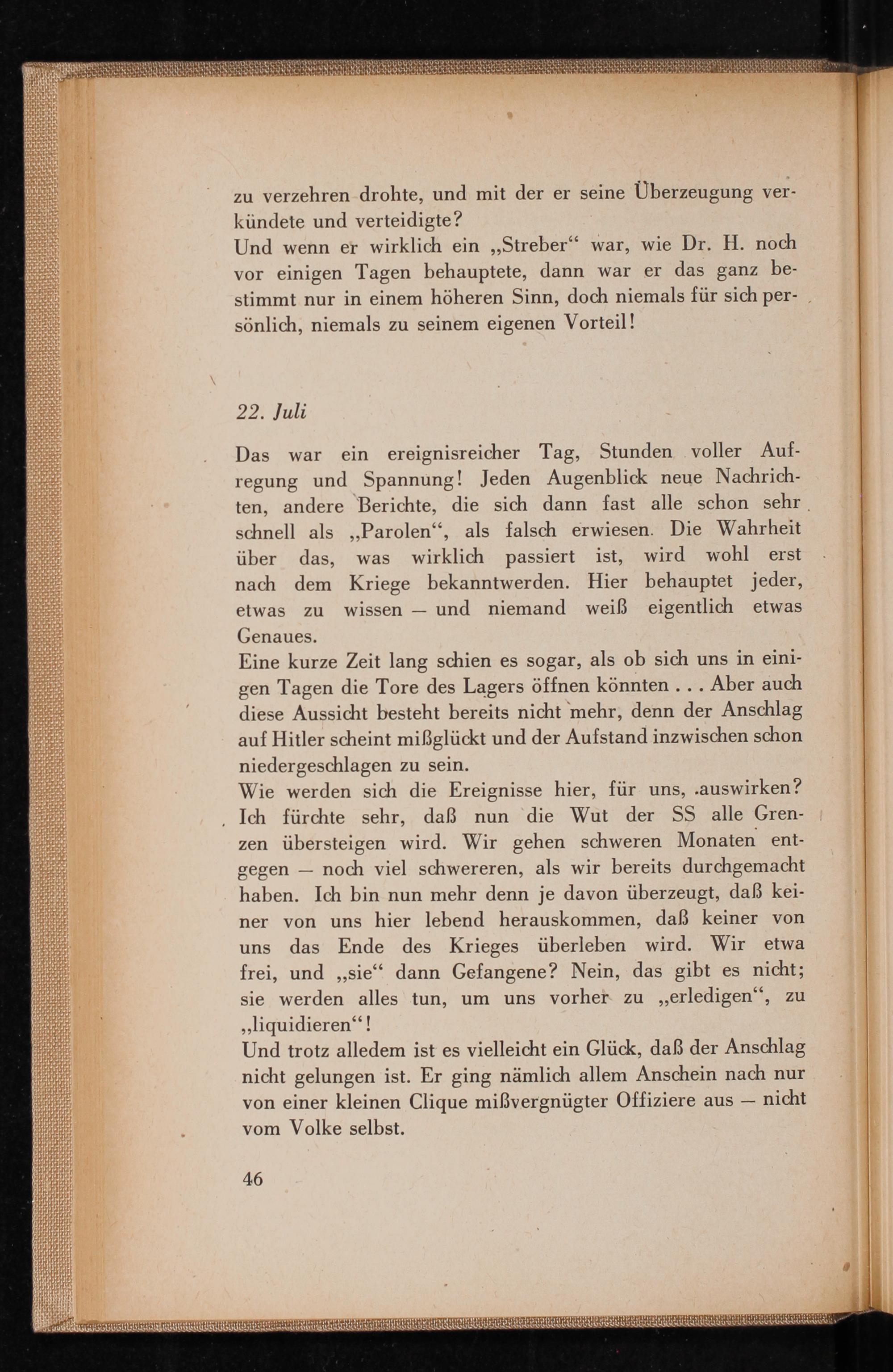 Eine kurze Zeit lang schien es sogar, als ob sich uns in einigen Tagen die Tore des Lagers öffnen könnten... Aber auch diese Aussicht besteht bereits nicht mehr, denn der Anschlag auf Hitler scheint miẞglückt und der Aufstand inzwischen schon niedergeschlagen zu sein.
