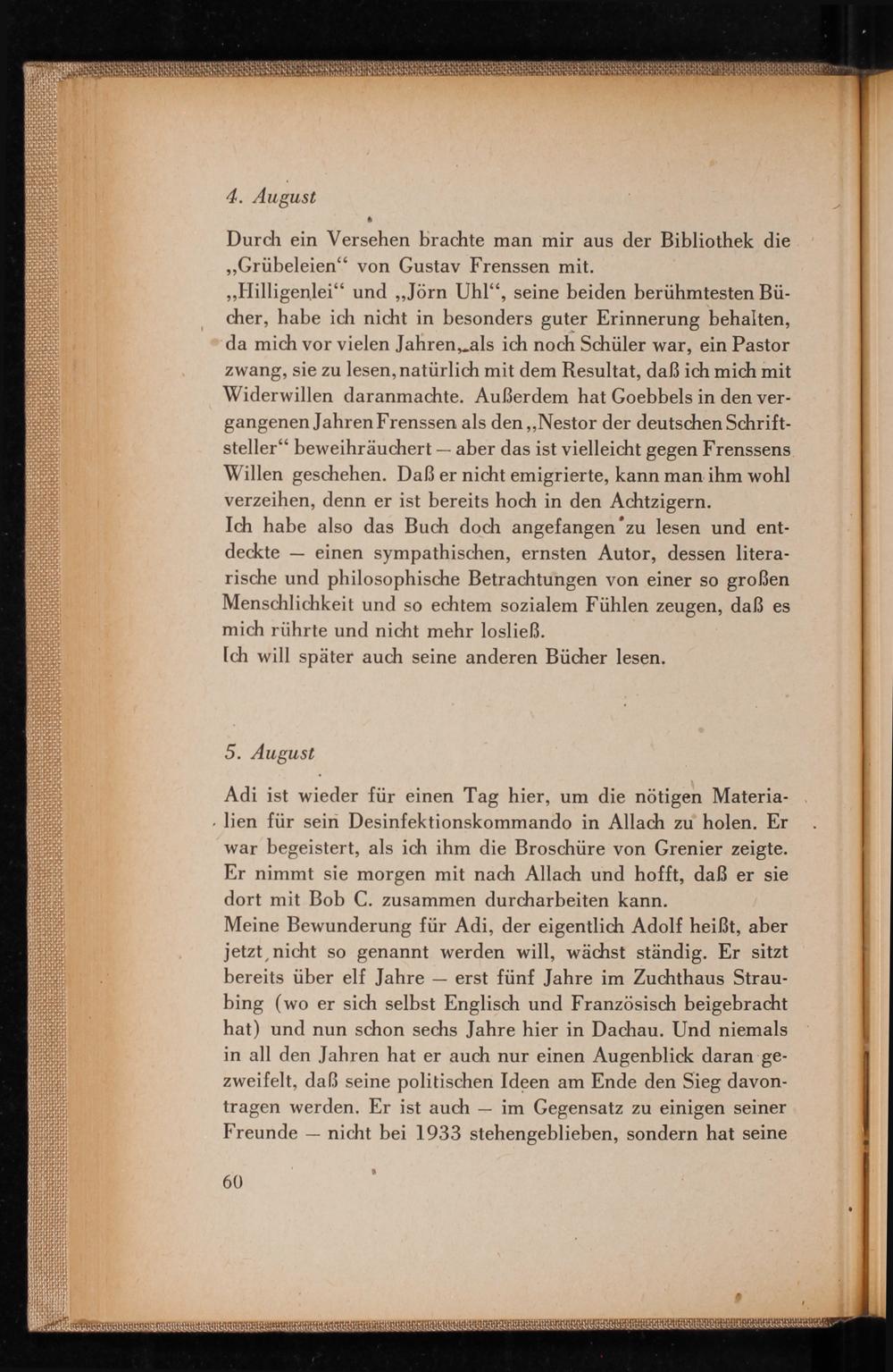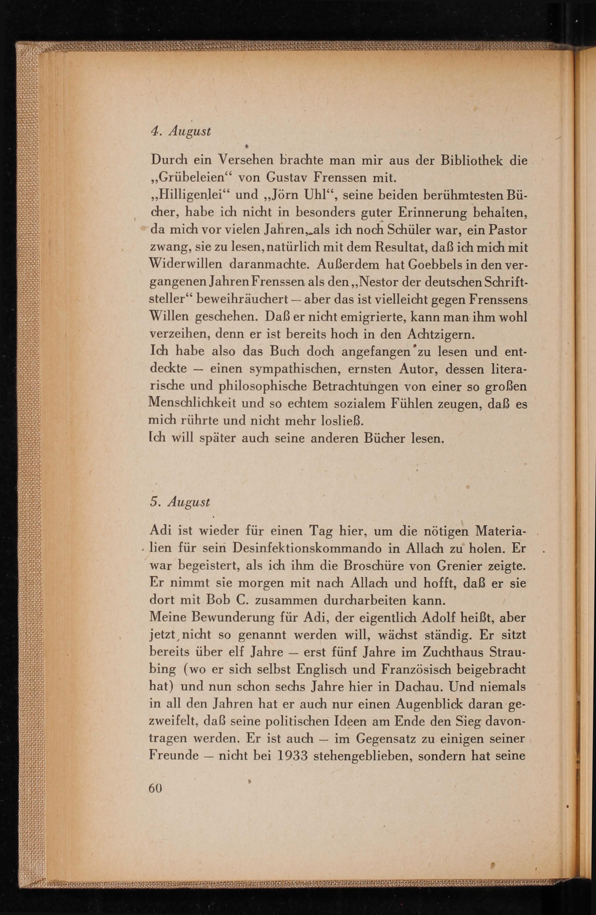 Meine Bewunderung für Adi, der eigentlich Adolf heißt, aber jetzt, nicht so genannt werden will, wächst ständig. Er sitzt bereits über elf Jahre erst fünf Jahre im Zuchthaus Straubing( wo er sich selbst Englisch und Französisch beigebracht hat) und nun schon sechs Jahre hier in Dachau . Und niemals in all den Jahren hat er auch nur einen Augenblick daran gezweifelt, daß seine politischen Ideen am Ende den Sieg davontragen werden. Er ist auch im Gegensatz zu einigen seiner Freunde nicht bei 1933 stehengeblieben, sondern hat seine