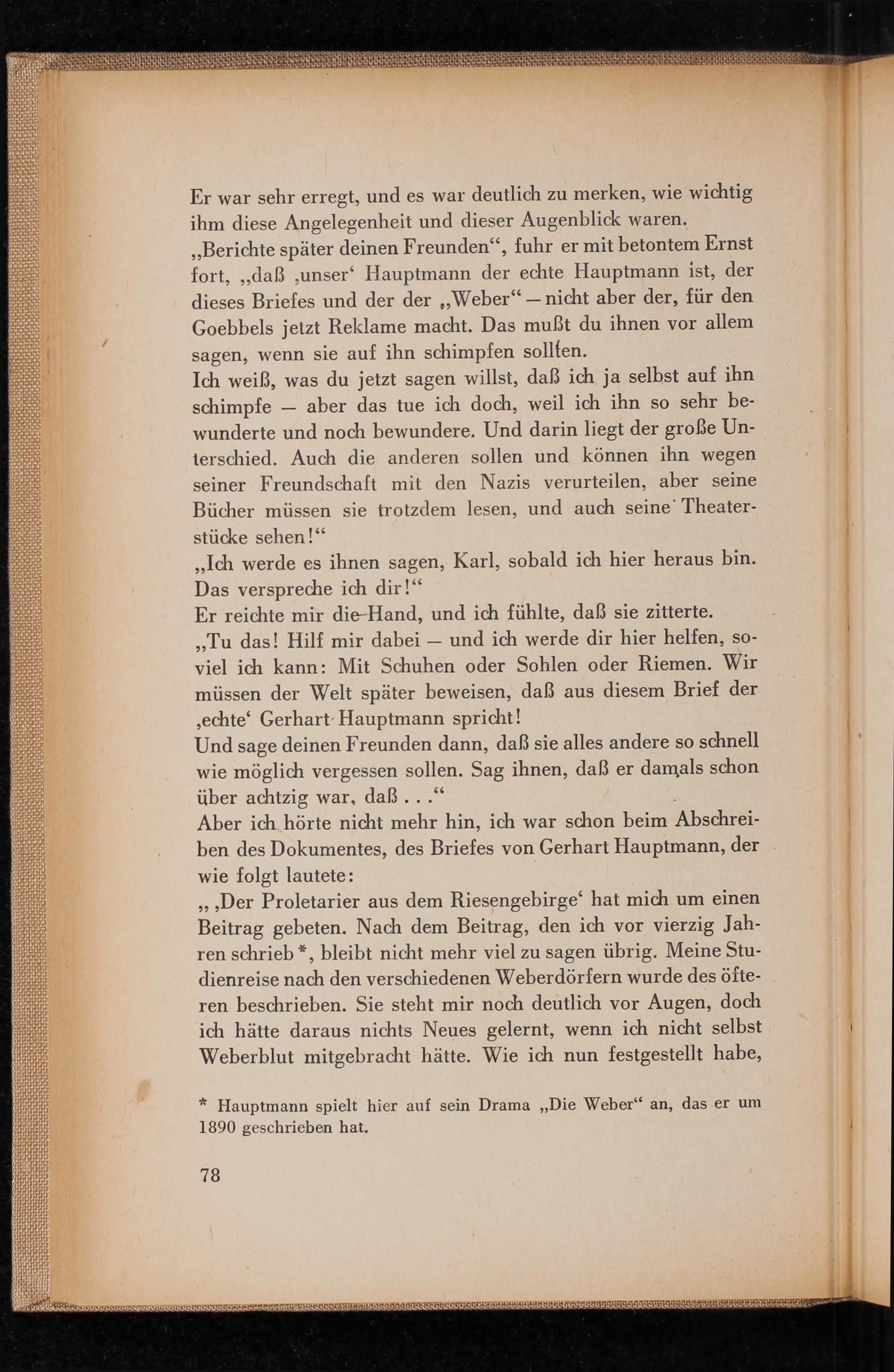 Er reichte mir die Hand, und ich fühlte, daß sie zitterte. ,, Tu das! Hilf mir dabei und ich werde dir hier helfen, soviel ich kann: Mit Schuhen oder Sohlen oder Riemen. Wir müssen der Welt später beweisen, daß aus diesem Brief der , echte' Gerhart Hauptmann spricht!