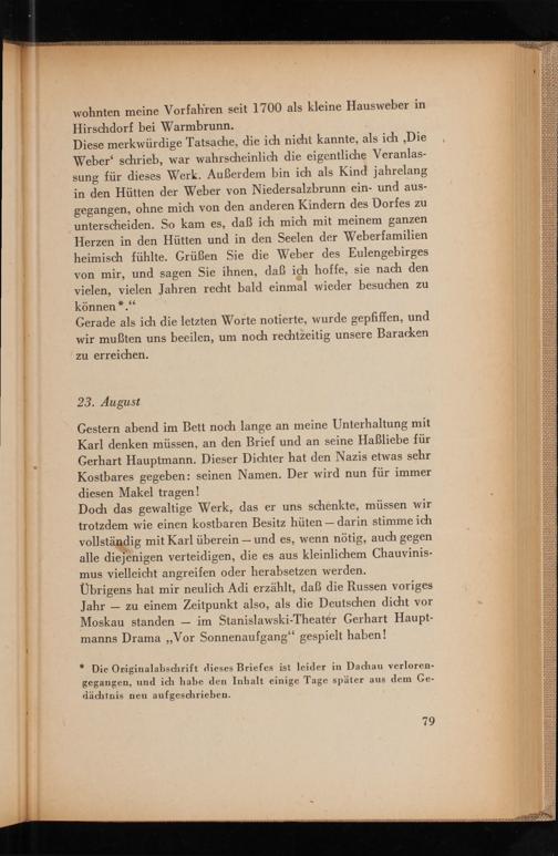 Gestern abend im Bett noch lange an meine Unterhaltung mit Karl denken müssen, an den Brief und an seine Haẞliebe für Gerhart Hauptmann . Dieser Dichter hat den Nazis etwas sehr Kostbares gegeben: seinen Namen. Der wird nun für immer diesen Makel tragen!