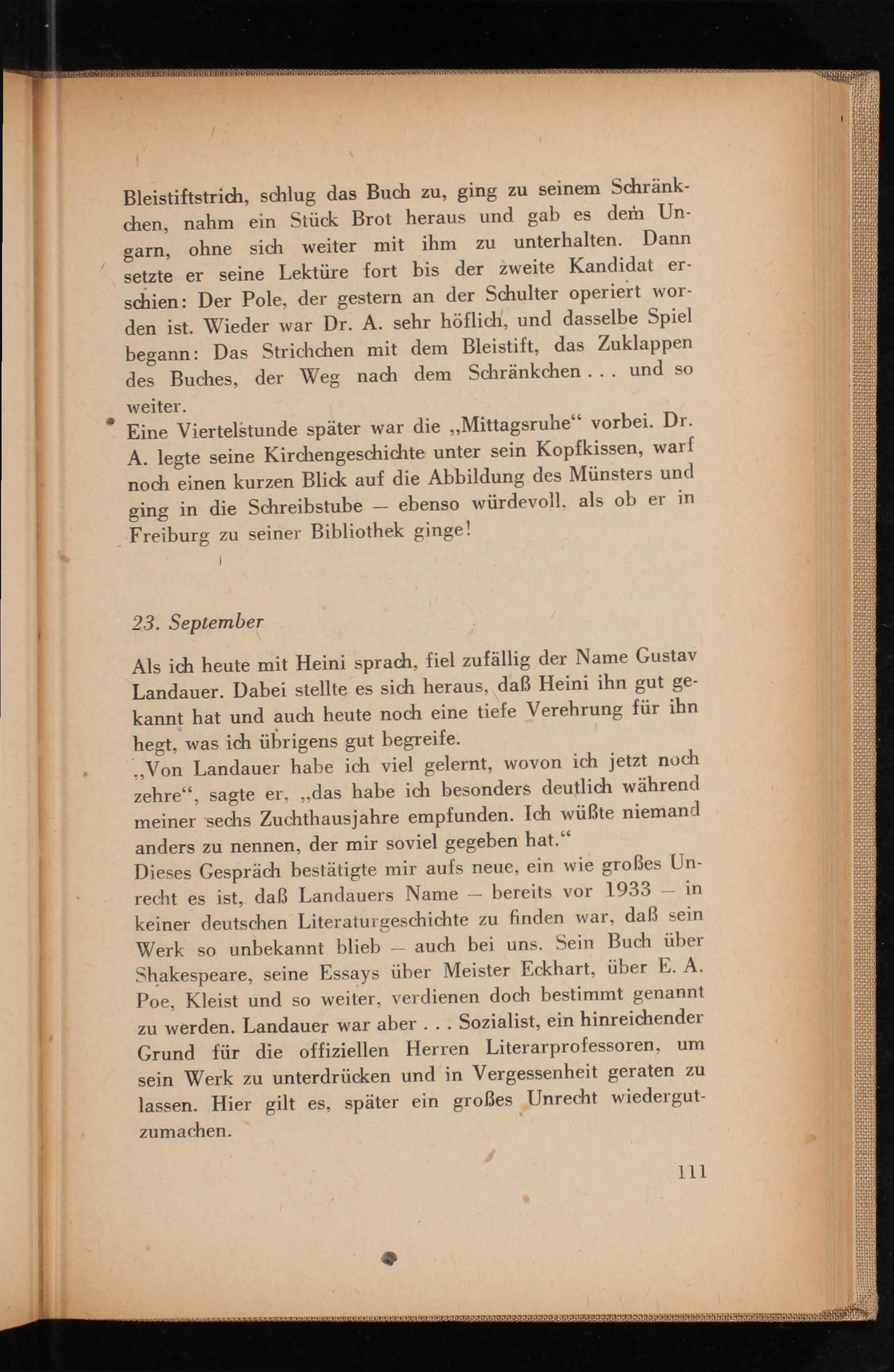 Dieses Gespräch bestätigte mir aufs neue, ein wie großes Unbereits vor 1933 in recht es ist, daß Landauers Name keiner deutschen Literaturgeschichte zu finden war, daß sein Werk so unbekannt blieb- auch bei uns. Sein Buch über Shakespeare, seine Essays über Meister Eckhart , über E. A. Poe, Kleist und so weiter, verdienen doch bestimmt genannt zu werden. Landauer war aber... Sozialist, ein hinreichender Grund für die offiziellen Herren Literarprofessoren, um sein Werk zu unterdrücken und in Vergessenheit geraten zu lassen. Hier gilt es, später ein großes Unrecht wiedergut