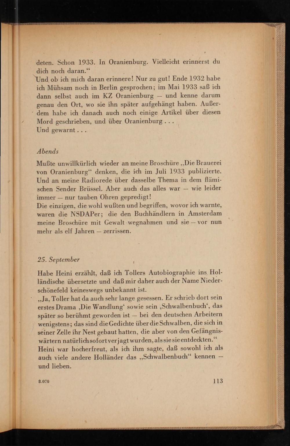 ,, Ja, Toller hat da auch sehr lange gesessen. Er schrieb dort sein erstes Drama, Die Wandlung ' sowie sein, Schwalbenbuch', das später so berühmt geworden ist- bei den deutschen Arbeitern wenigstens; das sind die Gedichte über die Schwalben, die sich in seiner Zelle ihr Nest gebaut hatten, die aber von den Gefängniswärtern natürlich sofort verjagt wurden, als sie sie entdeckten." Heini war hocherfreut, als ich ihm sagte, daß sowohl ich als auch viele andere Holländer das..Schwalbenbuch" kennen- und lieben.