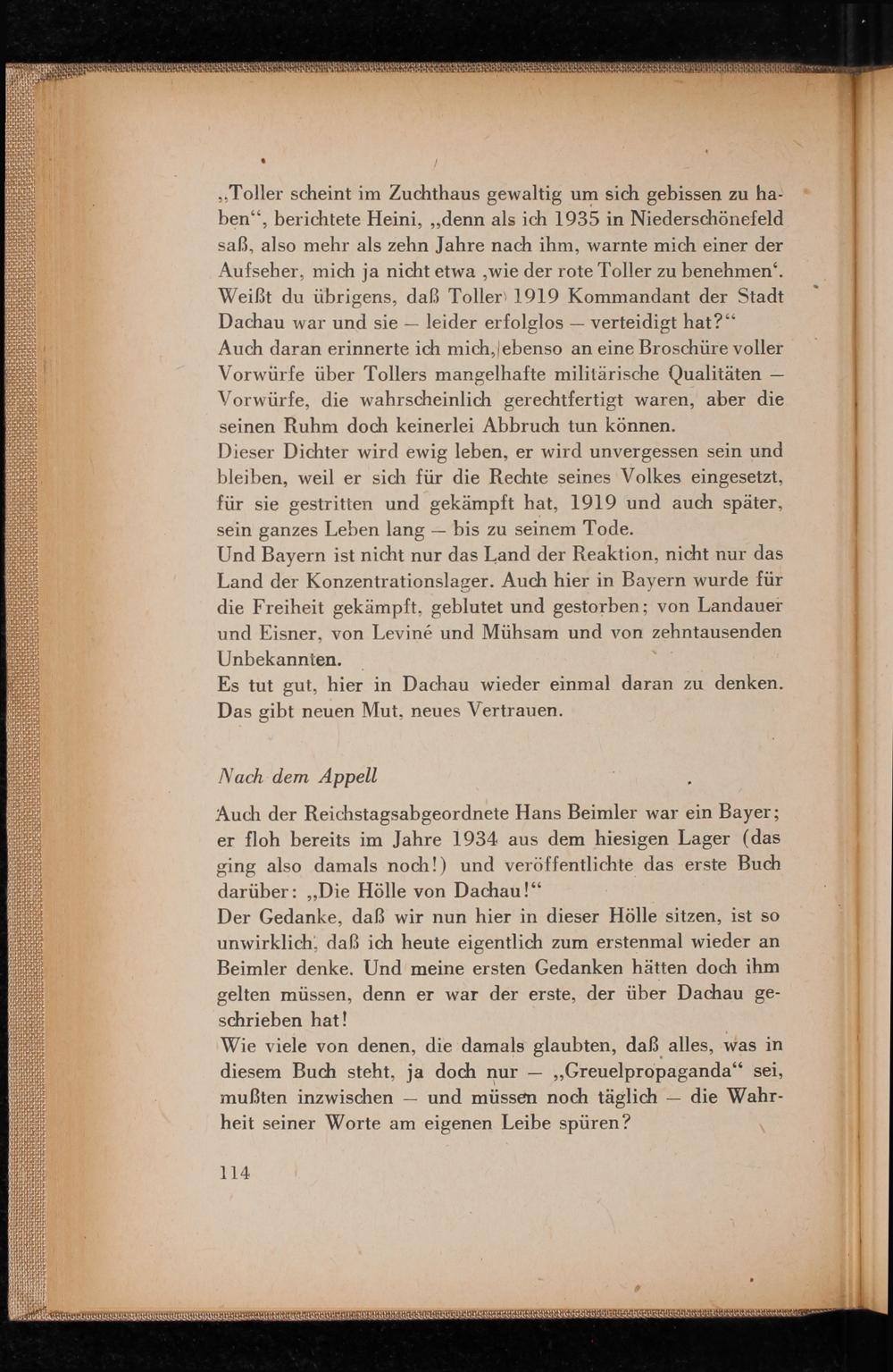 ,, Toller scheint im Zuchthaus gewaltig um sich gebissen zu haben“, berichtete Heini ,,, denn als ich 1935 in Niederschönefeld saß, also mehr als zehn Jahre nach ihm, warnte mich einer der Aufseher, mich ja nicht etwa, wie der rote Toller zu benehmen. Weißt du übrigens, daß Toller 1919 Kommandant der Stadt Dachau war und sie leider erfolglos verteidigt hat?"