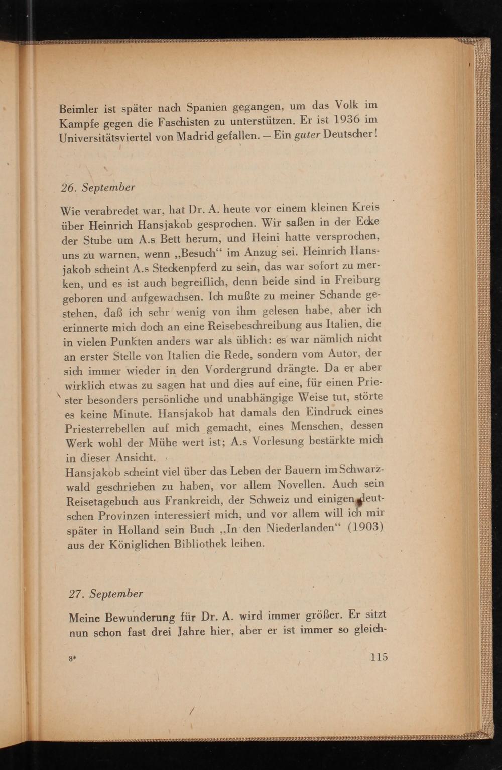 Wie verabredet war, hat Dr. A. heute vor einem kleinen Kreis über Heinrich Hansjakob gesprochen. Wir saßen in der Ecke der Stube um A.s Bett herum, und Heini hatte versprochen, uns zu warnen, wenn ,, Besuch" im Anzug sei. Heinrich Hansjakob scheint A.s Steckenpferd zu sein, das war sofort zu merken, und es ist auch begreiflich, denn beide sind in Freiburg geboren und aufgewachsen. Ich mußte zu meiner Schande gestehen, daß ich sehr wenig von ihm gelesen habe, aber ich erinnerte mich doch an eine Reisebeschreibung aus Italien , die in vielen Punkten anders war als üblich: es war nämlich nicht an erster Stelle von Italien die Rede, sondern vom Autor, der sich immer wieder in den Vordergrund drängte. Da er aber wirklich etwas zu sagen hat und dies auf eine, für einen Priester besonders persönliche und unabhängige Weise tut, störte es keine Minute. Hansjakob hat damals den Eindruck eines Priesterrebellen auf mich gemacht, eines Menschen, dessen Werk wohl der Mühe wert ist; A.s Vorlesung bestärkte mich in dieser Ansicht.