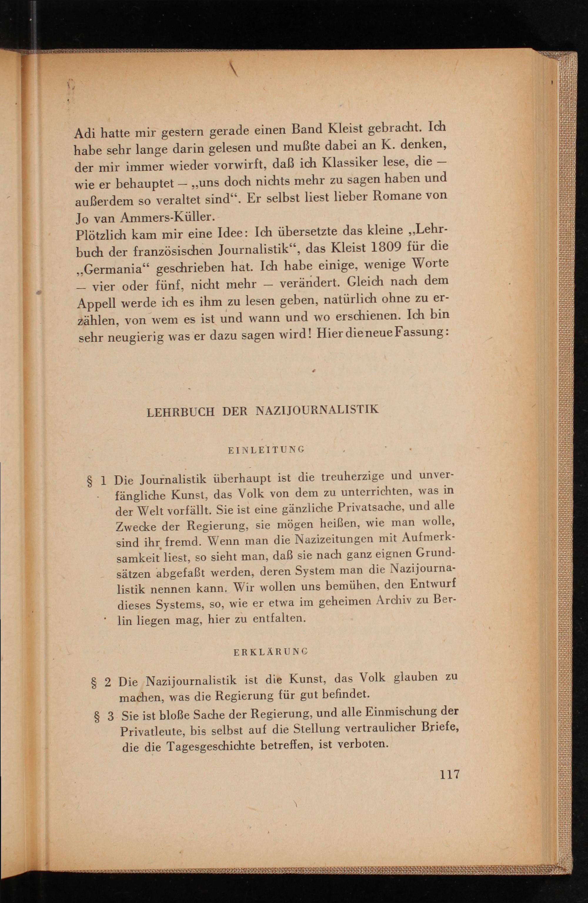 Plötzlich kam mir eine Idee: Ich übersetzte das kleine ,, Lehrbuch der französischen Journalistik", das Kleist 1809 für die ,, Germania" geschrieben hat. Ich habe einige, wenige Worte vier oder fünf, nicht mehr- verändert. Gleich nach dem Appell werde ich es ihm zu lesen geben, natürlich ohne zu erzählen, von wem es ist und wann und wo erschienen. Ich bin sehr neugierig was er dazu sagen wird! Hier die neue Fassung: