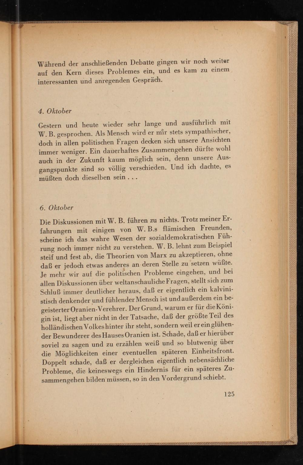 Die Diskussionen mit W. B. führen zu nichts. Trotz meiner Erfahrungen mit einigen von W. B.s flämischen Freunden, scheine ich das wahre Wesen der sozialdemokratischen Führung noch immer nicht zu verstehen. W. B. lehnt zum Beispiel steif und fest ab, die Theorien von Marx zu akzeptieren, ohne daß er jedoch etwas anderes an deren Stelle zu setzen wüßte. Je mehr wir auf die politischen Probleme eingehen, und bei allen Diskussionen über weltanschauliche Fragen, stellt sich zum Schluß immer deutlicher heraus, daß er eigentlich ein kalvinistisch denkender und fühlender Mensch ist und außerdem ein begeisterter Oranien- Verehrer. Der Grund, warum er für die Königin ist, liegt aber nicht in der Tatsache, daß der größte Teil des holländischen Volkes hinter ihr steht, sondern weil er ein glühender Bewunderer des Hauses Oranien ist. Schade, daß er hierüber soviel zu sagen und zu erzählen weiß und so blutwenig über die Möglichkeiten einer eventuellen späteren Einheitsfront. Doppelt schade, daß er dergleichen eigentlich nebensächliche Probleme, die keineswegs ein Hindernis für ein späteres Zusammengehen bilden müssen, so in den Vordergrund schiebt.