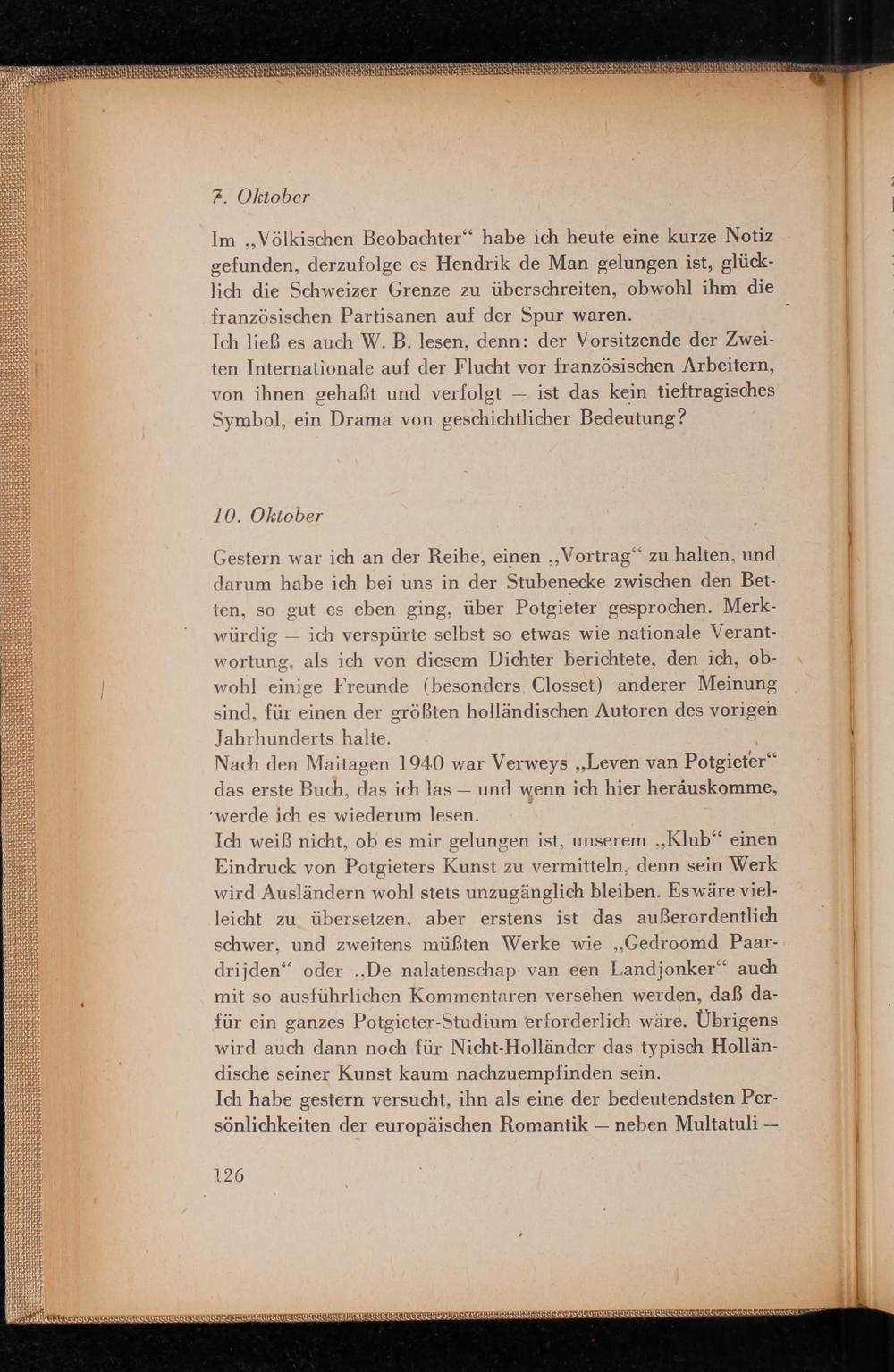 Gestern war ich an der Reihe, einen ,, Vortrag" zu halten, und darum habe ich bei uns in der Stubenecke zwischen den Betten, so gut es eben ging, über Potgieter gesprochen. Merkwürdig- ich verspürte selbst so etwas wie nationale Verantwortung, als ich von diesem Dichter berichtete, den ich, obwohl einige Freunde( besonders Closset) anderer Meinung sind, für einen der größten holländischen Autoren des vorigen. Jahrhunderts halte.
