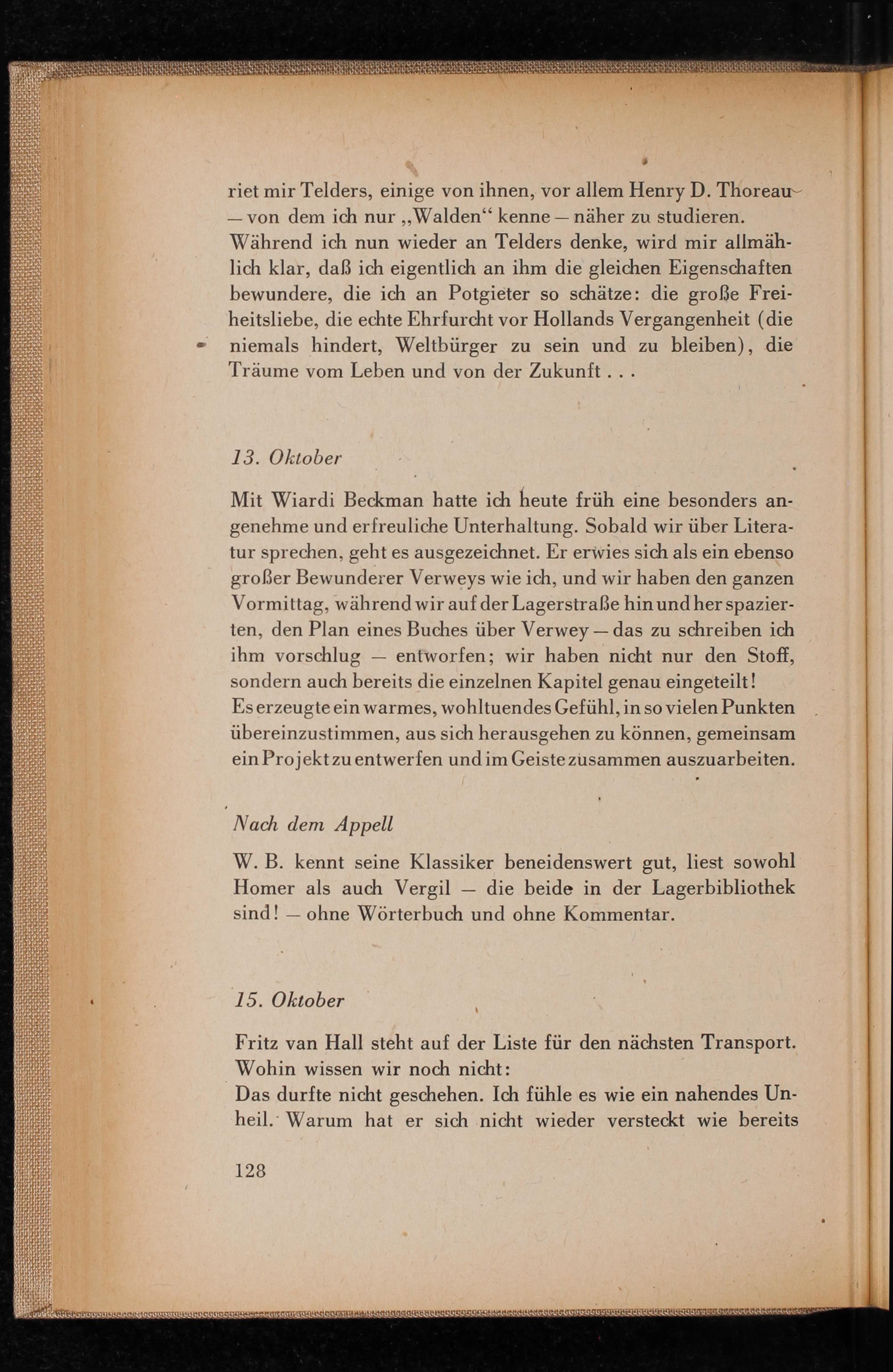 Mit Wiardi Beckman hatte ich heute früh eine besonders angenehme und erfreuliche Unterhaltung. Sobald wir über Literatur sprechen, geht es ausgezeichnet. Er erwies sich als ein ebenso großer Bewunderer Verweys wie ich, und wir haben den ganzen Vormittag, während wir auf der Lagerstraße hin und her spazierten, den Plan eines Buches über Verwey- das zu schreiben ich ihm vorschlug- entworfen; wir haben nicht nur den Stoff, sondern auch bereits die einzelnen Kapitel genau eingeteilt! Es erzeugte ein warmes, wohltuendes Gefühl, in so vielen Punkten übereinzustimmen, aus sich herausgehen zu können, gemeinsam ein Projekt zu entwerfen und im Geiste zusammen auszuarbeiten.