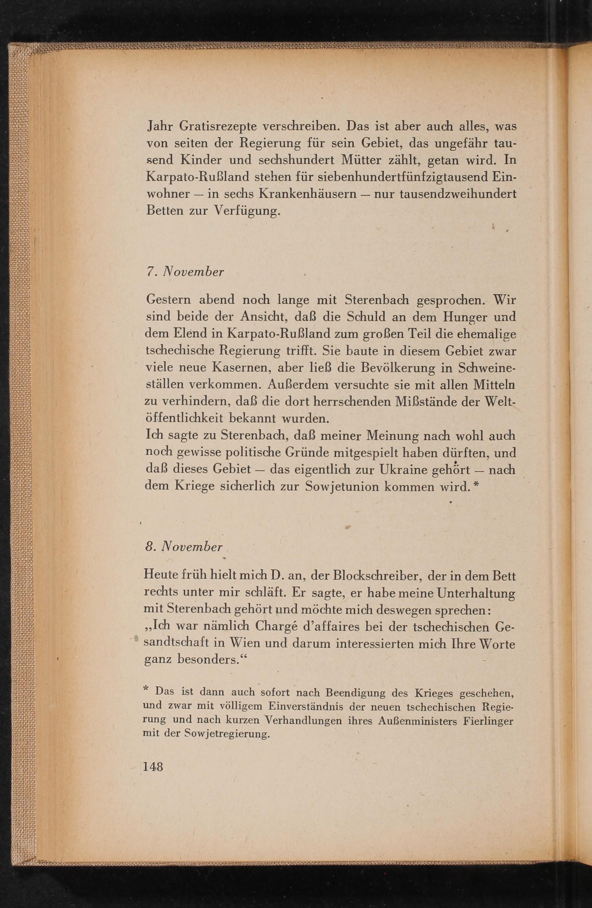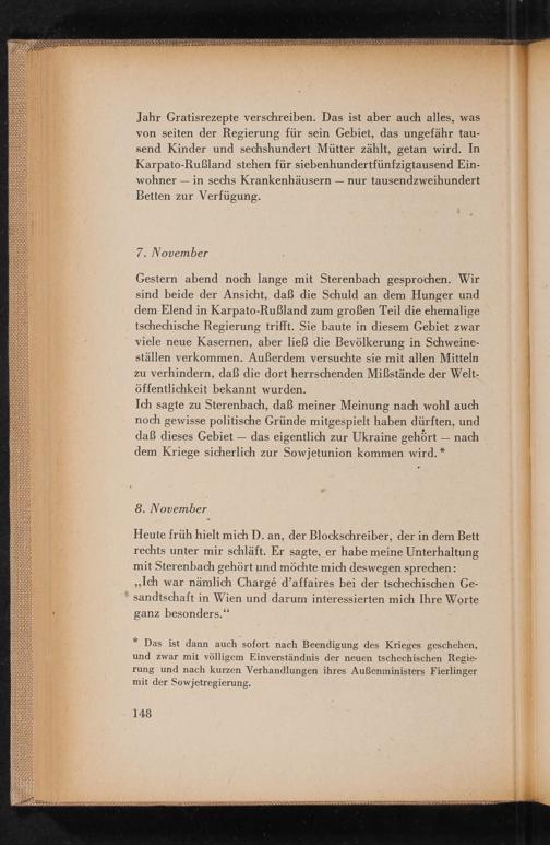 Gestern abend noch lange mit Sterenbach gesprochen. Wir sind beide der Ansicht, daß die Schuld an dem Hunger und dem Elend in Karpato- Rußland zum großen Teil die ehemalige tschechische Regierung trifft. Sie baute in diesem Gebiet zwar viele neue Kasernen, aber ließ die Bevölkerung in Schweineställen verkommen. Außerdem versuchte sie mit allen Mitteln zu verhindern, daß die dort herrschenden Miẞstände der Weltöffentlichkeit bekannt wurden.