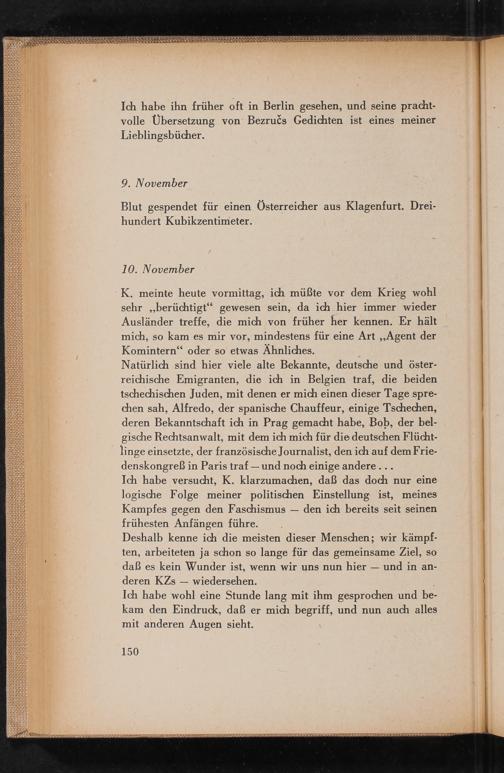 Natürlich sind hier viele alte Bekannte, deutsche und österreichische Emigranten, die ich in Belgien traf, die beiden tschechischen Juden, mit denen er mich einen dieser Tage sprechen sah, Alfredo, der spanische Chauffeur, einige Tschechen, deren Bekanntschaft ich in Prag gemacht habe, Bob, der belgische Rechtsanwalt, mit dem ich mich für die deutschen Flüchtlinge einsetzte, der französische Journalist, den ich auf dem Friedenskongreẞ in Paris traf- und noch einige andere...