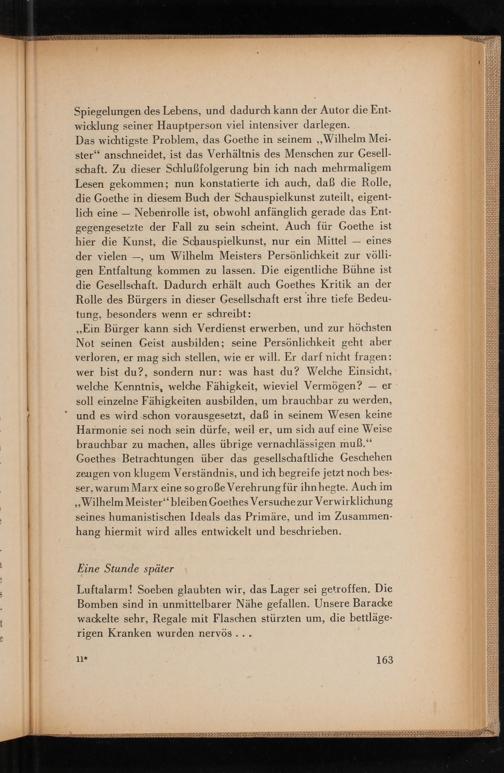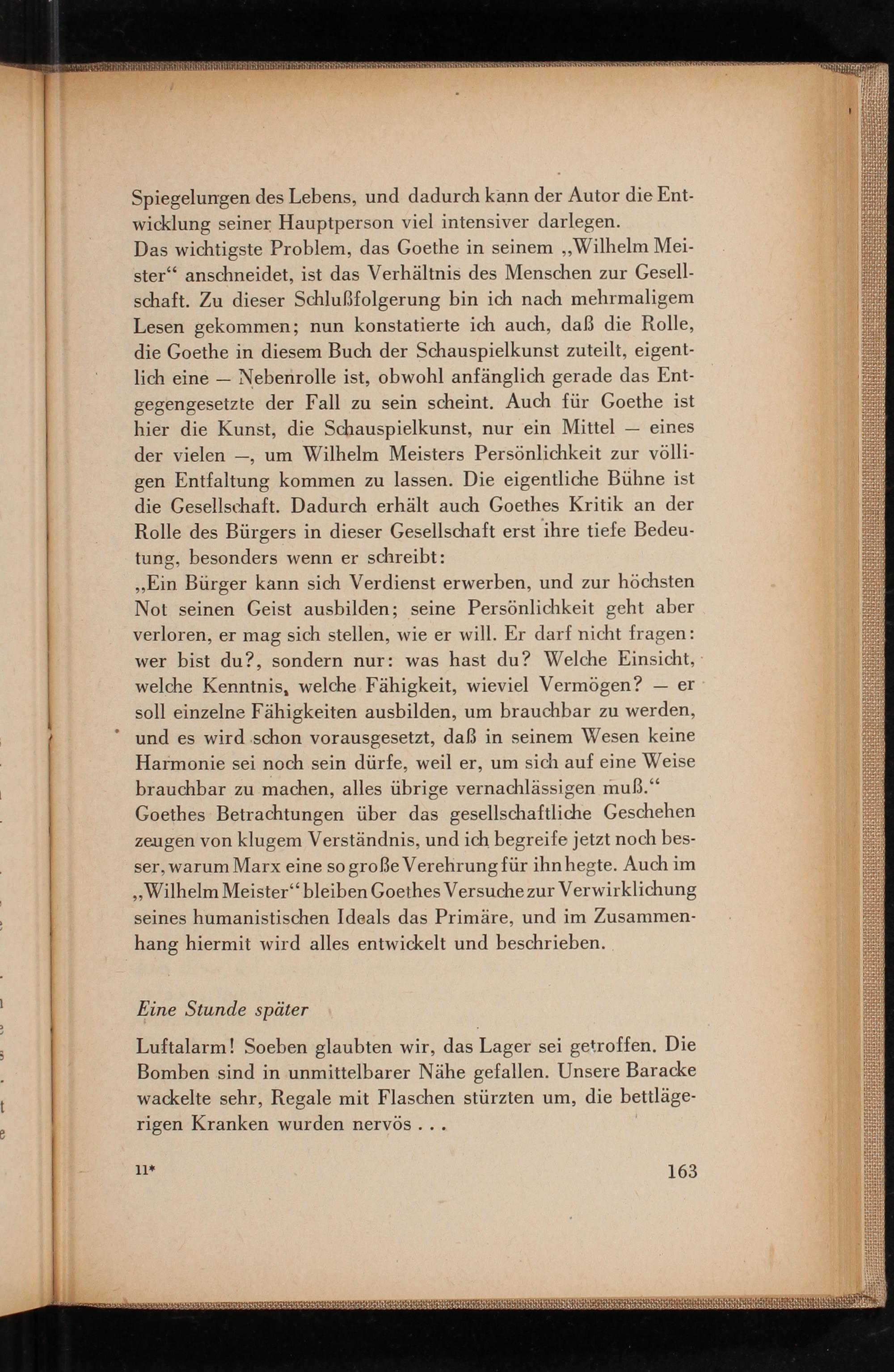 ,, Ein Bürger kann sich Verdienst erwerben, und zur höchsten Not seinen Geist ausbilden; seine Persönlichkeit geht aber verloren, er mag sich stellen, wie er will. Er darf nicht fragen: wer bist du?, sondern nur: was hast du? Welche Einsicht, welche Kenntnis, welche Fähigkeit, wieviel Vermögen?- er soll einzelne Fähigkeiten ausbilden, um brauchbar zu werden, und es wird schon vorausgesetzt, daß in seinem Wesen keine Harmonie sei noch sein dürfe, weil er, um sich auf eine Weise brauchbar zu machen, alles übrige vernachlässigen muß." Goethes Betrachtungen über das gesellschaftliche Geschehen zeugen von klugem Verständnis, und ich begreife jetzt noch besser, warum Marx eine so große Verehrung für ihn hegte. Auch im ,, Wilhelm Meister " bleiben Goethes Versuche zur Verwirklichung seines humanistischen Ideals das Primäre, und im Zusammenhang hiermit wird alles entwickelt und beschrieben.