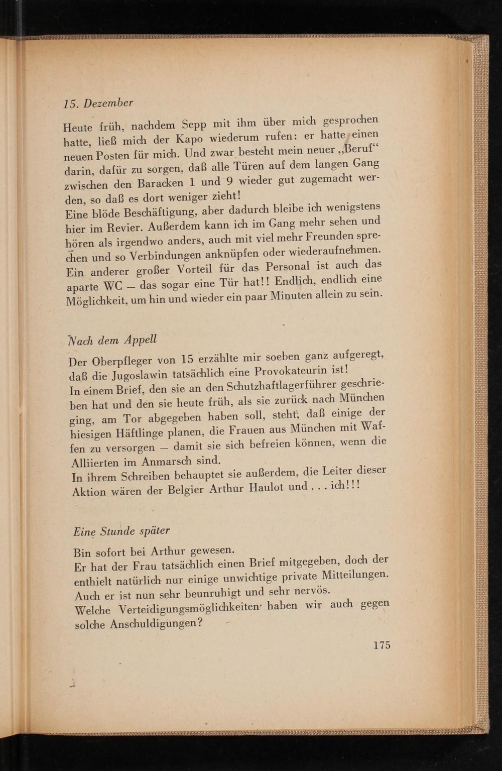 Heute früh, nachdem Sepp mit ihm über mich gesprochen hatte, ließ mich der Kapo wiederum rufen: er hatte einen neuen Posten für mich. Und zwar besteht mein neuer ,, Beruf" darin, dafür zu sorgen, daß alle Türen auf dem langen Gang zwischen den Baracken 1 und 9 wieder gut zugemacht werden, so daß es dort weniger zieht!
