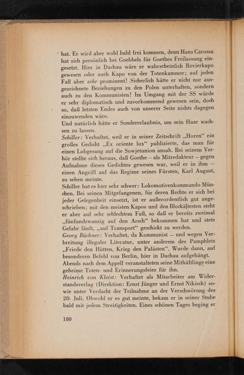 Schiller hat es hier sehr schwer: Lokomotivenkommando München. Bei seinen Mitgefangenen, für deren Rechte er sich bei jeder Gelegenheit einsetzt, ist er außerordentlich gut angeschrieben; mit den meisten Kapos und den Blockältesten steht er aber auf sehr schlechtem Fuß, so daß er bereits zweimal ,, fünfundzwanzig auf den Arsch" bekommen hat und stets Gefahr läuft ,,, auf Transport" geschickt zu werden. Georg Büchner : Verhaftet, da Kommunist- und wegen Verbreitung illegaler Literatur, unter anderem des Pamphlets ,, Friede den Hütten, Krieg den Palästen". Wurde dann, auf besonderen Befehl von Berlin, hier in Dachau aufgehängt. Abends nach dem Appell veranstalteten seine Mithäftlinge eine geheime Toten- und Erinnerungsfeier für ihn.