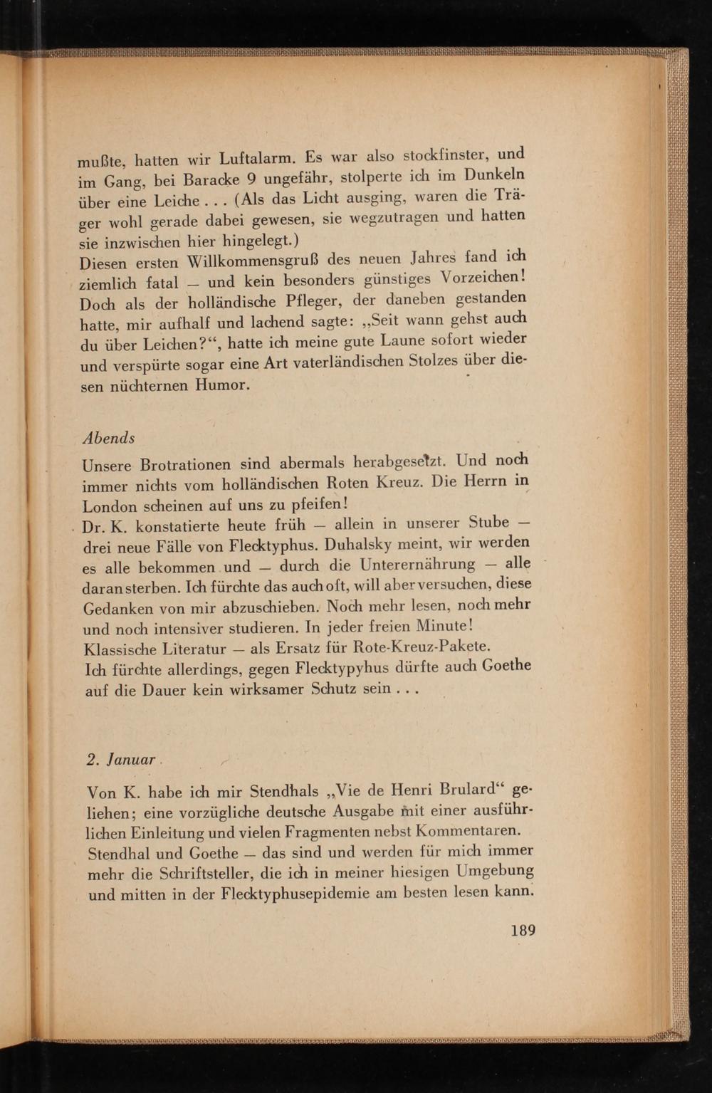 Von K. habe ich mir Stendhals ,, Vie de Henri Brulard" geliehen; eine vorzügliche deutsche Ausgabe mit einer ausführlichen Einleitung und vielen Fragmenten nebst Kommentaren. Stendhal und Goethe das sind und werden für mich immer mehr die Schriftsteller, die ich in meiner hiesigen Umgebung und mitten in der Flecktyphusepidemie am besten lesen kann.