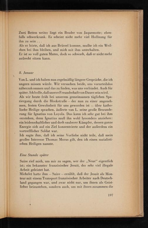 Van L. und ich haben nun regelmäßig längere Gespräche, die ich ungern missen würde. Wir versuchen beide, uns vorurteilslos näherzukommen und das zu finden, was uns verbindet. Auch für später. Ich hoffe, daß unsere Freundschaft von Dauer sein wird. Als wir heute früh bei unserem gemeinsamen täglichen Spaziergang durch die Blockstraße der nun zu einer angenehmen, festen Gewohnheit für uns geworden ist über katholische Heilige sprachen, äußerte van L. seine große Bewunderung für Ignatius von Loyola . Das kann ich sehr gut bei ihm verstehen, denn Ignatius muß ihn wohl besonders anziehen: ein leidenschaftlicher und doch sauberer Kämpfer, dessen ganze Energie sich auf ein Ziel konzentrierte und der außerdem ein vortrefflicher Soldat war.