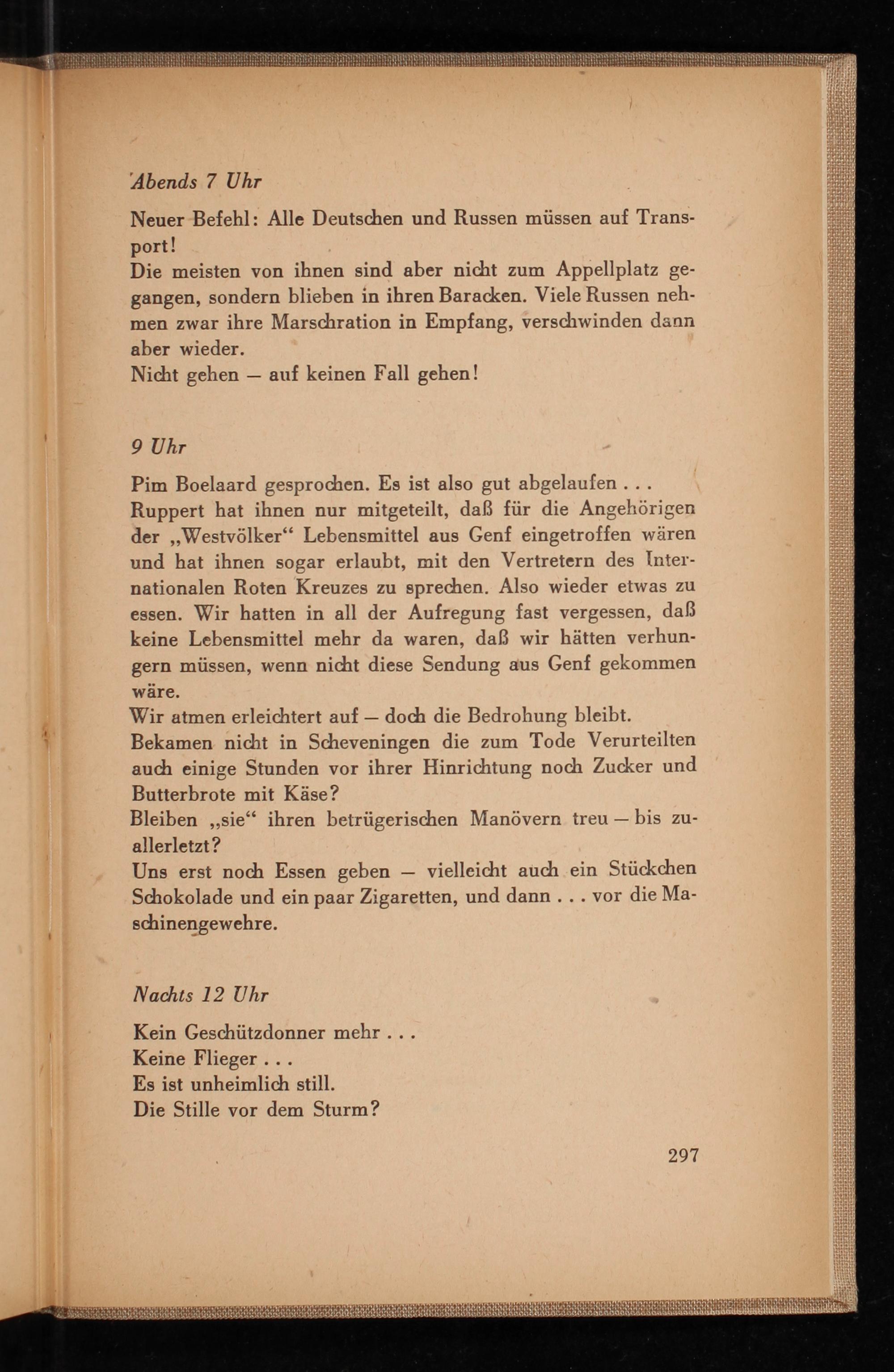 Pim Boelaard gesprochen. Es ist also gut abgelaufen... Ruppert hat ihnen nur mitgeteilt, daß für die Angehörigen der ,, Westvölker" Lebensmittel aus Genf eingetroffen wären und hat ihnen sogar erlaubt, mit den Vertretern des Internationalen Roten Kreuzes zu sprechen. Also wieder etwas zu essen. Wir hatten in all der Aufregung fast vergessen, daß keine Lebensmittel mehr da waren, daß wir hätten verhungern müssen, wenn nicht diese Sendung aus Genf gekommen wäre.