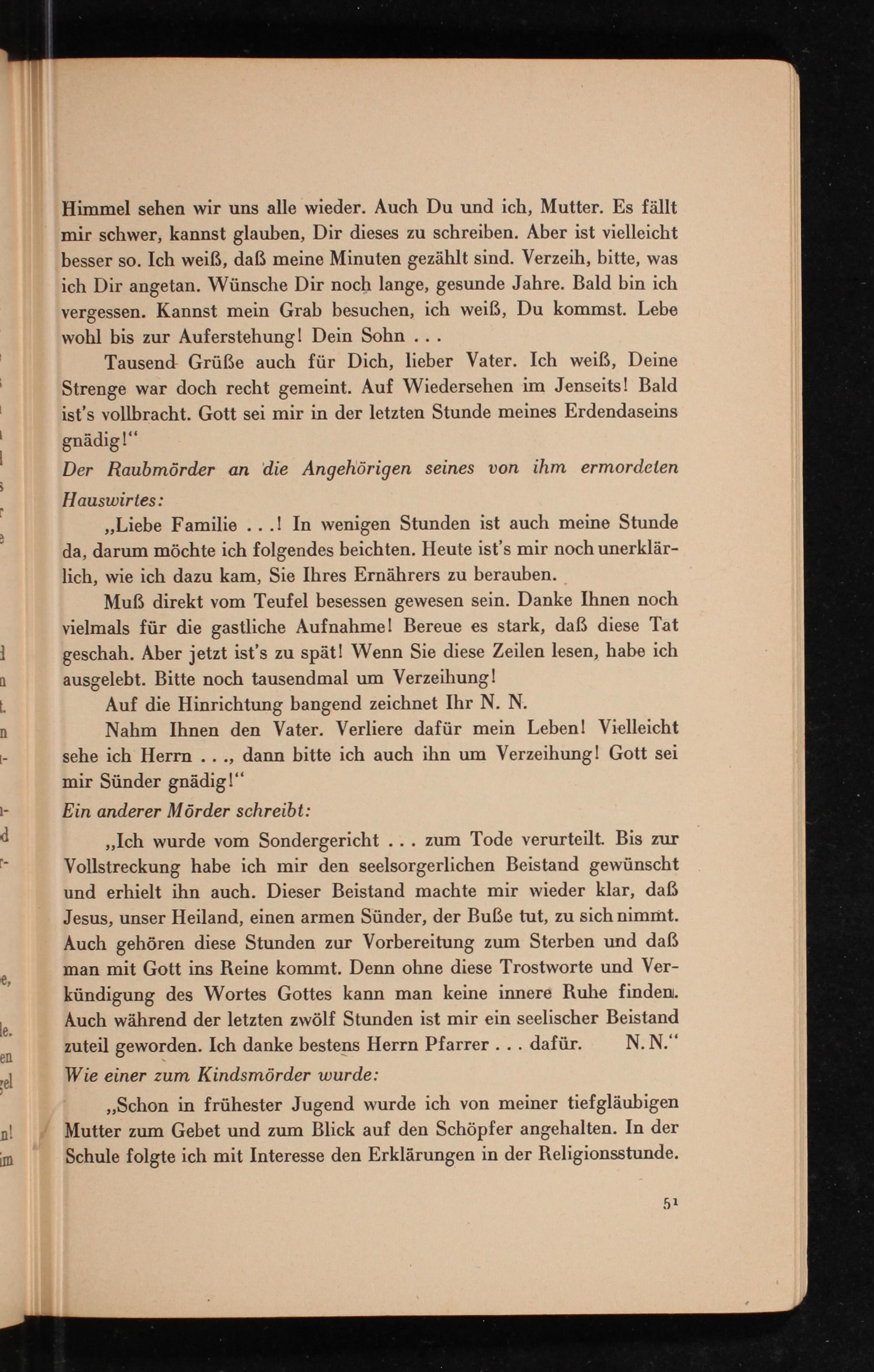 ,, Ich wurde vom Sondergericht... zum Tode verurteilt. Bis zur Vollstreckung habe ich mir den seelsorgerlichen Beistand gewünscht und erhielt ihn auch. Dieser Beistand machte mir wieder klar, daß Jesus, unser Heiland, einen armen Sünder, der Buße tut, zu sich nimmt. Auch gehören diese Stunden zur Vorbereitung zum Sterben und daß man mit Gott ins Reine kommt. Denn ohne diese Trostworte und Verkündigung des Wortes Gottes kann man keine innere Ruhe finden. Auch während der letzten zwölf Stunden ist mir ein seelischer Beistand zuteil geworden. Ich danke bestens Herrn Pfarrer... dafür. N. N." Wie einer zum Kindsmörder wurde: