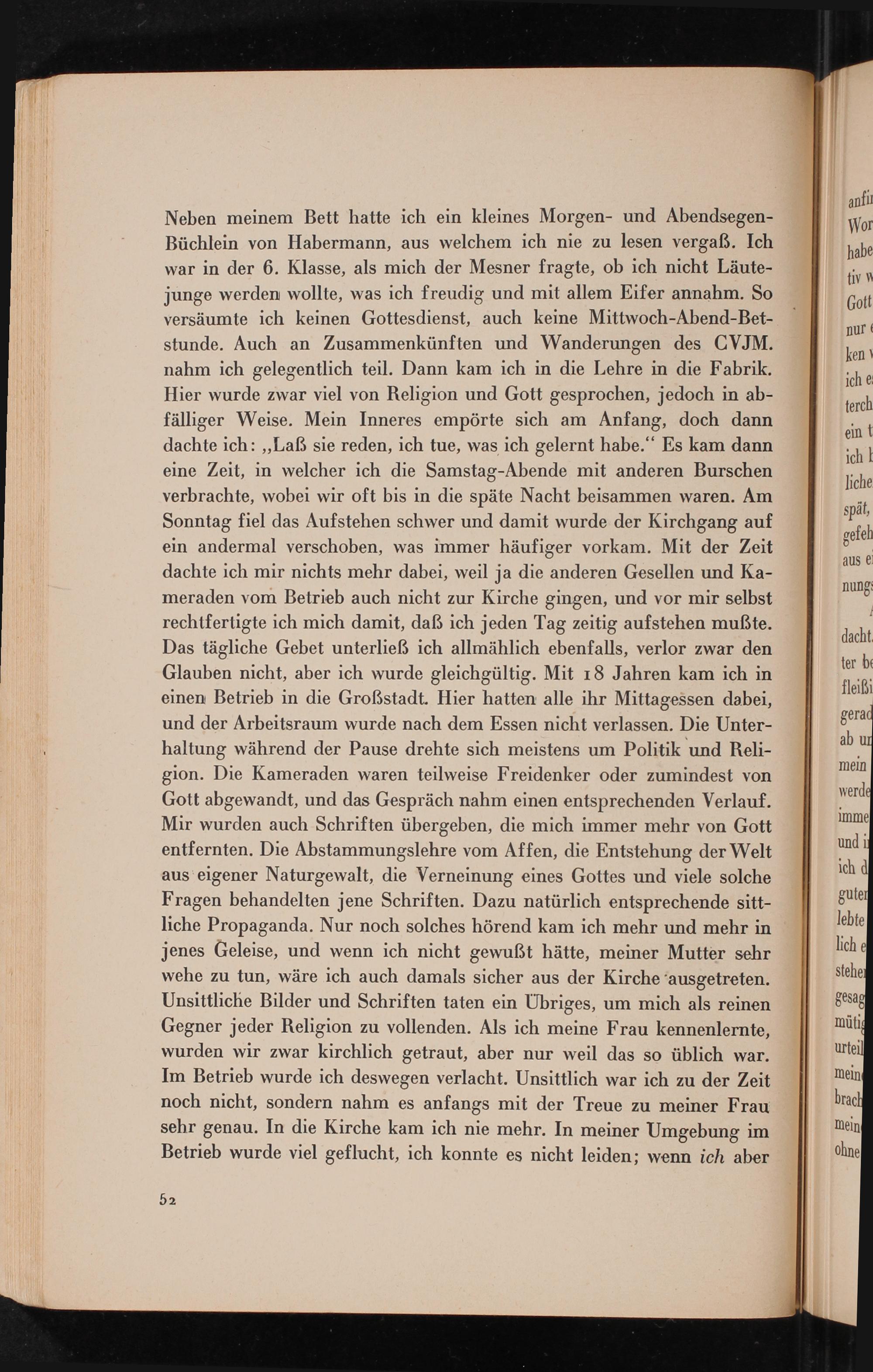 Neben meinem Bett hatte ich ein kleines Morgen- und AbendsegenBüchlein von Habermann, aus welchem ich nie zu lesen vergaß. Ich war in der 6. Klasse, als mich der Mesner fragte, ob ich nicht Läutejunge werden wollte, was ich freudig und mit allem Eifer annahm. So versäumte ich keinen Gottesdienst, auch keine Mittwoch- Abend- Betstunde. Auch an Zusammenkünften und Wanderungen des CVJM. nahm ich gelegentlich teil. Dann kam ich in die Lehre in die Fabrik. Hier wurde zwar viel von Religion und Gott gesprochen, jedoch in abfälliger Weise. Mein Inneres empörte sich am Anfang, doch dann dachte ich: ,, Laß sie reden, ich tue, was ich gelernt habe." Es kam dann eine Zeit, in welcher ich die Samstag- Abende mit anderen Burschen verbrachte, wobei wir oft bis in die späte Nacht beisammen waren. Am Sonntag fiel das Aufstehen schwer und damit wurde der Kirchgang auf ein andermal verschoben, was immer häufiger vorkam. Mit der Zeit dachte ich mir nichts mehr dabei, weil ja die anderen Gesellen und Kameraden vom Betrieb auch nicht zur Kirche gingen, und vor mir selbst rechtfertigte ich mich damit, daß ich jeden Tag zeitig aufstehen mußte. Das tägliche Gebet unterließ ich allmählich ebenfalls, verlor zwar den Glauben nicht, aber ich wurde gleichgültig. Mit 18 Jahren kam ich in einen Betrieb in die Großstadt. Hier hatten alle ihr Mittagessen dabei, und der Arbeitsraum wurde nach dem Essen nicht verlassen. Die Unterhaltung während der Pause drehte sich meistens um Politik und Religion. Die Kameraden waren teilweise Freidenker oder zumindest von Gott abgewandt, und das Gespräch nahm einen entsprechenden Verlauf. Mir wurden auch Schriften übergeben, die mich immer mehr von Gott entfernten. Die Abstammungslehre vom Affen, die Entstehung der Welt aus eigener Naturgewalt, die Verneinung eines Gottes und viele solche Fragen behandelten jene Schriften. Dazu natürlich entsprechende sittliche Propaganda. Nur noch solches hörend kam ich mehr und mehr in jenes Geleise, und wenn ich nicht gewußt hätte, meiner Mutter sehr wehe zu tun, wäre ich auch damals sicher aus der Kirche ausgetreten. Unsittliche Bilder und Schriften taten ein Übriges, um mich als reinen Gegner jeder Religion zu vollenden. Als ich meine Frau kennenlernte, wurden wir zwar kirchlich getraut, aber nur weil das so üblich war. Im Betrieb wurde ich deswegen verlacht. Unsittlich war ich zu der Zeit noch nicht, sondern nahm es anfangs mit der Treue zu meiner Frau sehr genau. In die Kirche kam ich nie mehr. In meiner Umgebung im Betrieb wurde viel geflucht, ich konnte es nicht leiden; wenn ich aber
