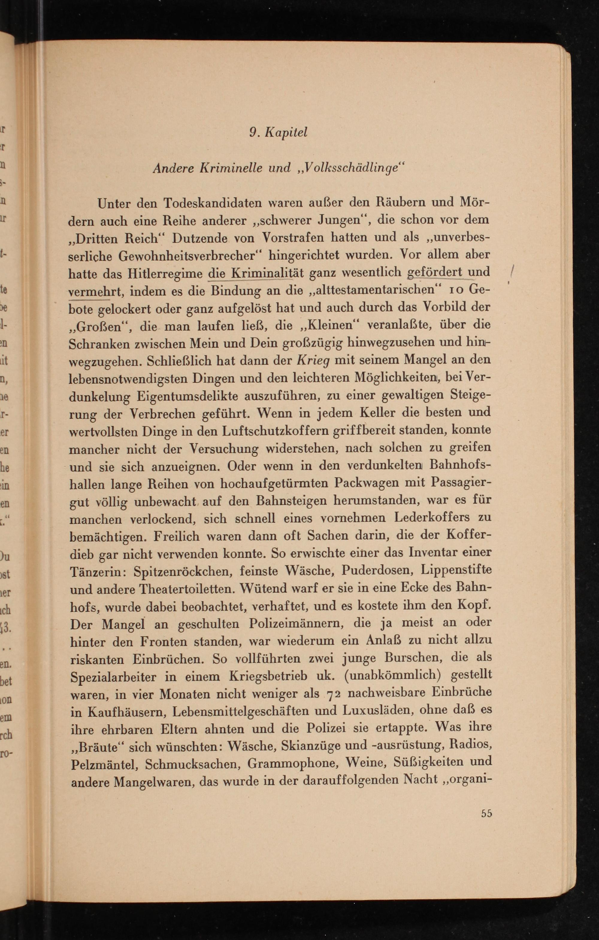 Unter den Todeskandidaten waren außer den Räubern und Mör- dern auch eine Reihe anderer ‚schwerer Jungen“, die schon vor dem „Dritten Reich ‘ Dutzende von Vorstrafen hatten und als„unverbes- serliche Gewohnheitsverbrecher“ hingerichtet wurden. Vor allem aber hatte das Hitlerregime die Kriminalität ganz wesentlich gefördert und vermehrt, indem es die Bindung an die„alttestamentarischen“ 10 Ge- bote gelockert oder ganz aufgelöst hat und auch durch das Vorbild der „Großen“, die man laufen ließ, die„Kleinen“ veranlaßte, über die Schranken zwischen Mein und Dein großzügig hinwegzusehen und hin- wegzugehen. Schließlich hat dann der Krieg mit seinem Mangel an den lebensnotwendigsten Dingen und den leichteren Möglichkeiten, bei Ver- dunkelung Eigentumsdelikte auszuführen, zu einer gewaltigen Steige- rung der Verbrechen geführt. Wenn in jedem Keller die besten und wertvollsten Dinge in den Luftschutzkoffern griffbereit standen, konnte mancher nicht der Versuchung widerstehen, nach solchen zu greifen und sie sich anzueignen. Oder wenn in den verdunkelten Bahnhofs- hallen lange Reihen von hochaufgetürmten Packwagen mit Passagier- gut völlig unbewacht. auf den Bahnsteigen herumstanden, war es für manchen verlockend, sich schnell eines vornehmen Lederkoffers zu bemächtigen. Freilich waren dann oft Sachen darin, die der Koffer- dieb gar nicht verwenden konnte. So erwischte einer das Inventar einer Tänzerin: Spitzenröckchen, feinste Wäsche, Puderdosen, Lippenstifte und andere Theatertoiletten. Wütend warf er sie in eine Ecke des Bahn- hofs, wurde dabei beobachtet, verhaftet, und es kostete ihm den Kopf. Der Mangel an geschulten Polizeimännern, die ja meist an oder hinter den Fronten standen, war wiederum ein Anlaß zu nicht allzu riskanten Einbrüchen. So vollführten zwei junge Burschen, die als Spezialarbeiter in einem Kriegsbetrieb uk.(unabkömmlich) gestellt waren, in vier Monaten nicht weniger als 72 nachweisbare Einbrüche in Kaufhäusern, Lebensmittelgeschäften und Luxusläden, ohne daß es ihre ehrbaren Eltern ahnten und die Polizei sie ertappte. Was ihre „Bräute“ sich wünschten: Wäsche, Skianzüge und-ausrüstung, Radios, Pelzmäntel, Schmucksachen, Grammophone, Weine, Süßigkeiten und andere Mangelwaren, das wurde in der darauffolgenden Nacht„organi-