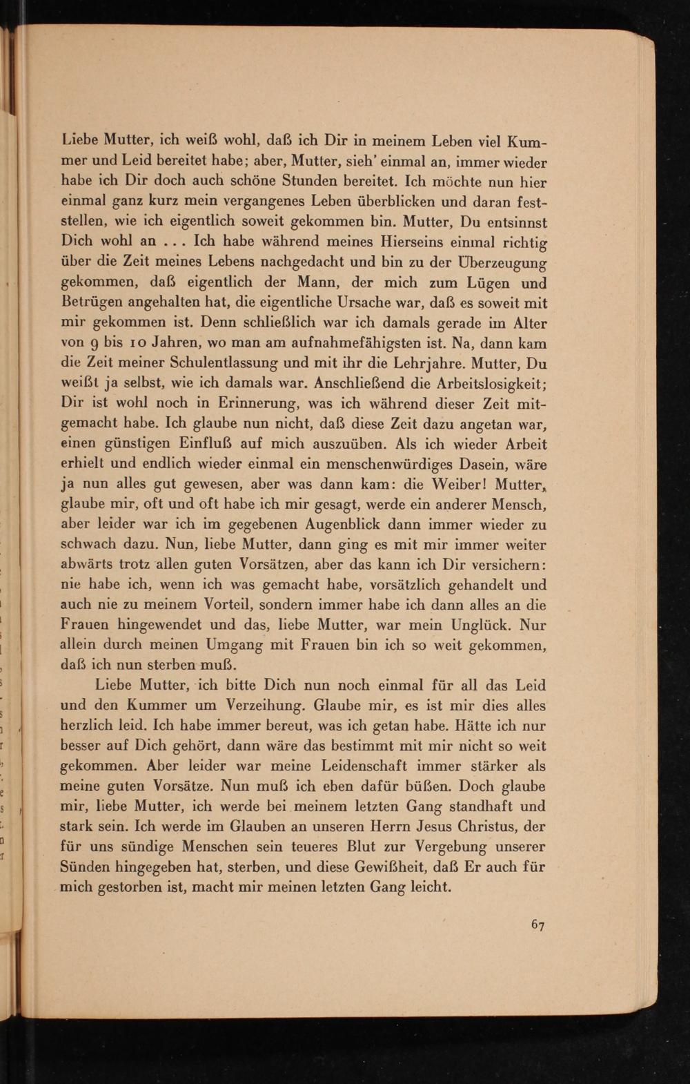 Liebe Mutter, ich weiß wohl, daß ich Dir in meinem Leben viel Kummer und Leid bereitet habe; aber, Mutter, sieh' einmal an, immer wieder habe ich Dir doch auch schöne Stunden bereitet. Ich möchte nun hier einmal ganz kurz mein vergangenes Leben überblicken und daran feststellen, wie ich eigentlich soweit gekommen bin. Mutter, Du entsinnst Dich wohl an... Ich habe während meines Hierseins einmal richtig über die Zeit meines Lebens nachgedacht und bin zu der Überzeugung gekommen, daß eigentlich der Mann, der mich zum Lügen und Betrügen angehalten hat, die eigentliche Ursache war, daß es soweit mit mir gekommen ist. Denn schließlich war ich damals gerade im Alter von 9 bis 10 Jahren, wo man am aufnahmefähigsten ist. Na, dann kam die Zeit meiner Schulentlassung und mit ihr die Lehrjahre. Mutter, Du weißt ja selbst, wie ich damals war. Anschließend die Arbeitslosigkeit; Dir ist wohl noch in Erinnerung, was ich während dieser Zeit mitgemacht habe. Ich glaube nun nicht, daß diese Zeit dazu angetan war, einen günstigen Einfluß auf mich auszuüben. Als ich wieder Arbeit erhielt und endlich wieder einmal ein menschenwürdiges Dasein, wäre ja nun alles gut gewesen, aber was dann kam: die Weiber! Mutter, glaube mir, oft und oft habe ich mir gesagt, werde ein anderer Mensch, aber leider war ich im gegebenen Augenblick dann immer wieder zu schwach dazu. Nun, liebe Mutter, dann ging es mit mir immer weiter abwärts trotz allen guten Vorsätzen, aber das kann ich Dir versichern: nie habe ich, wenn ich was gemacht habe, vorsätzlich gehandelt und auch nie zu meinem Vorteil, sondern immer habe ich dann alles an die Frauen hingewendet und das, liebe Mutter, war mein Unglück. Nur allein durch meinen Umgang mit Frauen bin ich so weit gekommen, daß ich nun sterben muß.