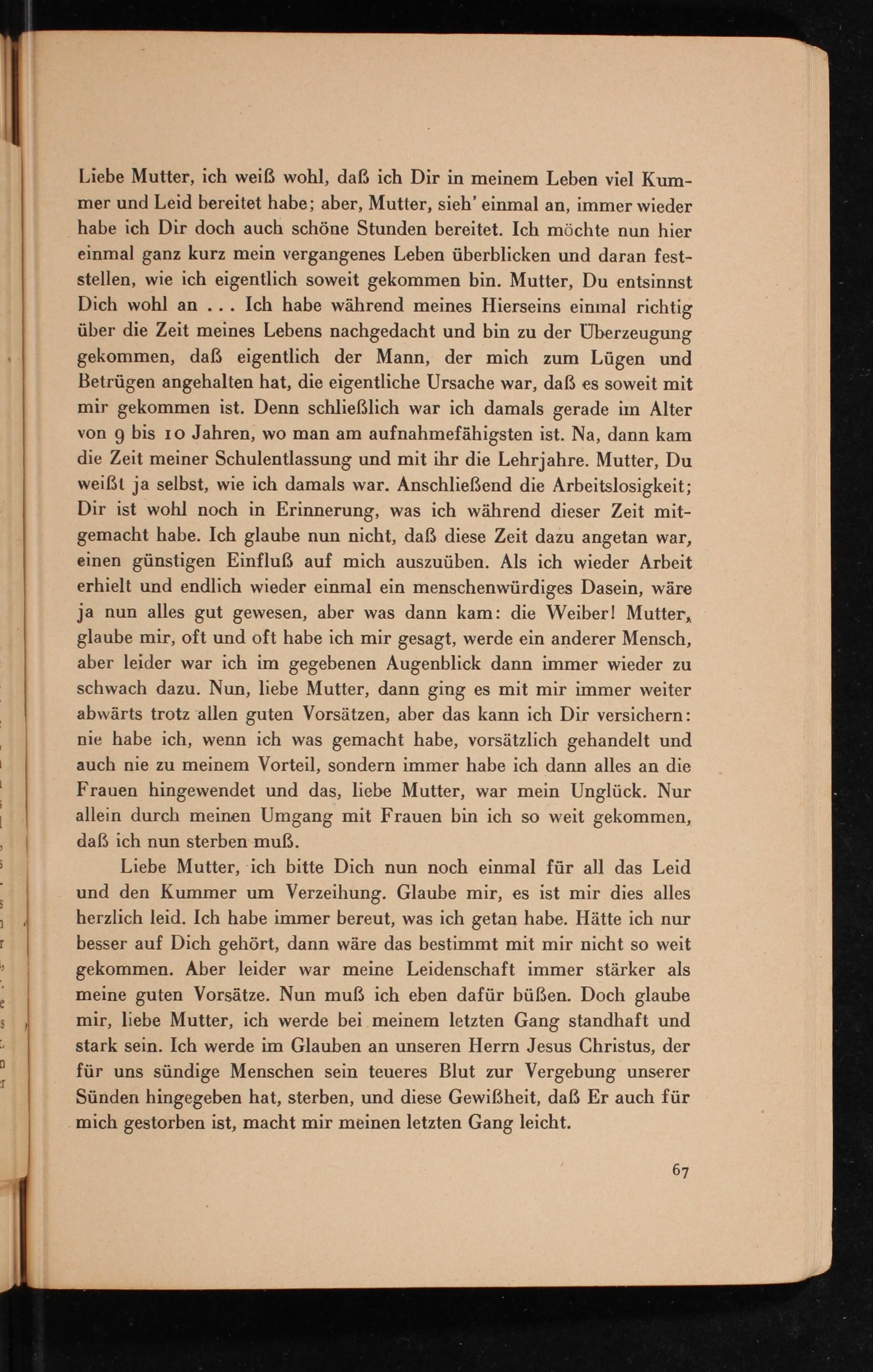 Liebe Mutter, ich bitte Dich nun noch einmal für all das Leid und den Kummer um Verzeihung. Glaube mir, es ist mir dies alles herzlich leid. Ich habe immer bereut, was ich getan habe. Hätte ich nur besser auf Dich gehört, dann wäre das bestimmt mit mir nicht so weit gekommen. Aber leider war meine Leidenschaft immer stärker als meine guten Vorsätze. Nun muß ich eben dafür büßen. Doch glaube mir, liebe Mutter, ich werde bei meinem letzten Gang standhaft und stark sein. Ich werde im Glauben an unseren Herrn Jesus Christus , der für uns sündige Menschen sein teueres Blut zur Vergebung unserer Sünden hingegeben hat, sterben, und diese Gewißheit, daß Er auch für mich gestorben ist, macht mir meinen letzten Gang leicht.