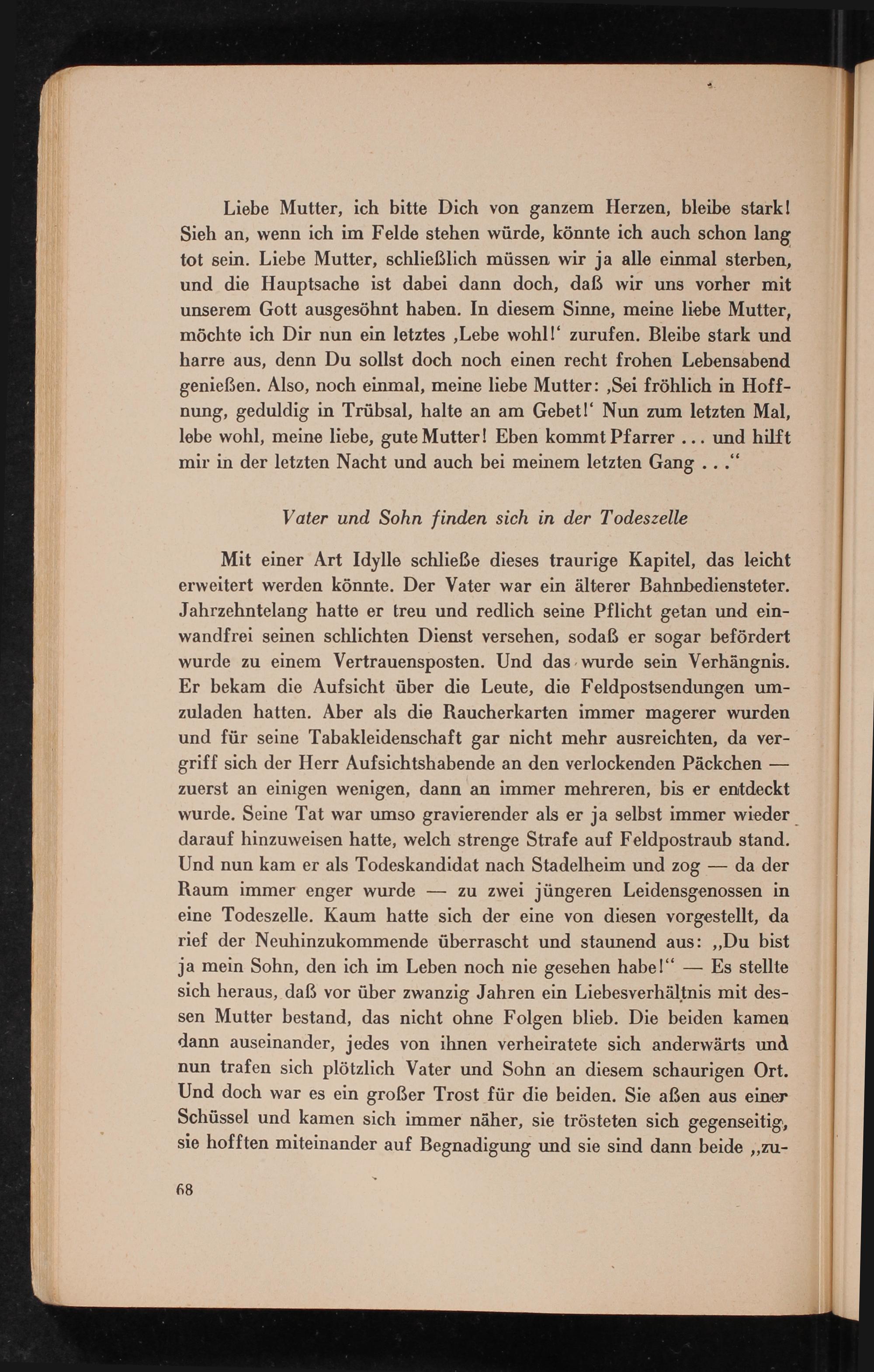 Mit einer Art Idylle schließe dieses traurige Kapitel, das leicht erweitert werden könnte. Der Vater war ein älterer Bahnbediensteter. Jahrzehntelang hatte er treu und redlich seine Pflicht getan und einwandfrei seinen schlichten Dienst versehen, sodaẞ er sogar befördert wurde zu einem Vertrauensposten. Und das wurde sein Verhängnis. Er bekam die Aufsicht über die Leute, die Feldpostsendungen umzuladen hatten. Aber als die Raucherkarten immer magerer wurden und für seine Tabakleidenschaft gar nicht mehr ausreichten, da vergriff sich der Herr Aufsichtshabende an den verlockenden Päckchen zuerst an einigen wenigen, dann an immer mehreren, bis er entdeckt wurde. Seine Tat war umso gravierender als er ja selbst immer wieder darauf hinzuweisen hatte, welch strenge Strafe auf Feldpostraub stand. Und nun kam er als Todeskandidat nach Stadelheim und zog- da der Raum immer enger wurde zu zwei jüngeren Leidensgenossen in eine Todeszelle. Kaum hatte sich der eine von diesen vorgestellt, da rief der Neuhinzukommende überrascht und staunend aus: ,, Du bist ja mein Sohn, den ich im Leben noch nie gesehen habe!" Es stellte sich heraus, daß vor über zwanzig Jahren ein Liebesverhältnis mit dessen Mutter bestand, das nicht ohne Folgen blieb. Die beiden kamen dann auseinander, jedes von ihnen verheiratete sich anderwärts und nun trafen sich plötzlich Vater und Sohn an diesem schaurigen Ort. Und doch war es ein großer Trost für die beiden. Sie aßen aus einer Schüssel und kamen sich immer näher, sie trösteten sich gegenseitig, sie hofften miteinander auf Begnadigung und sie sind dann beide ,, zu