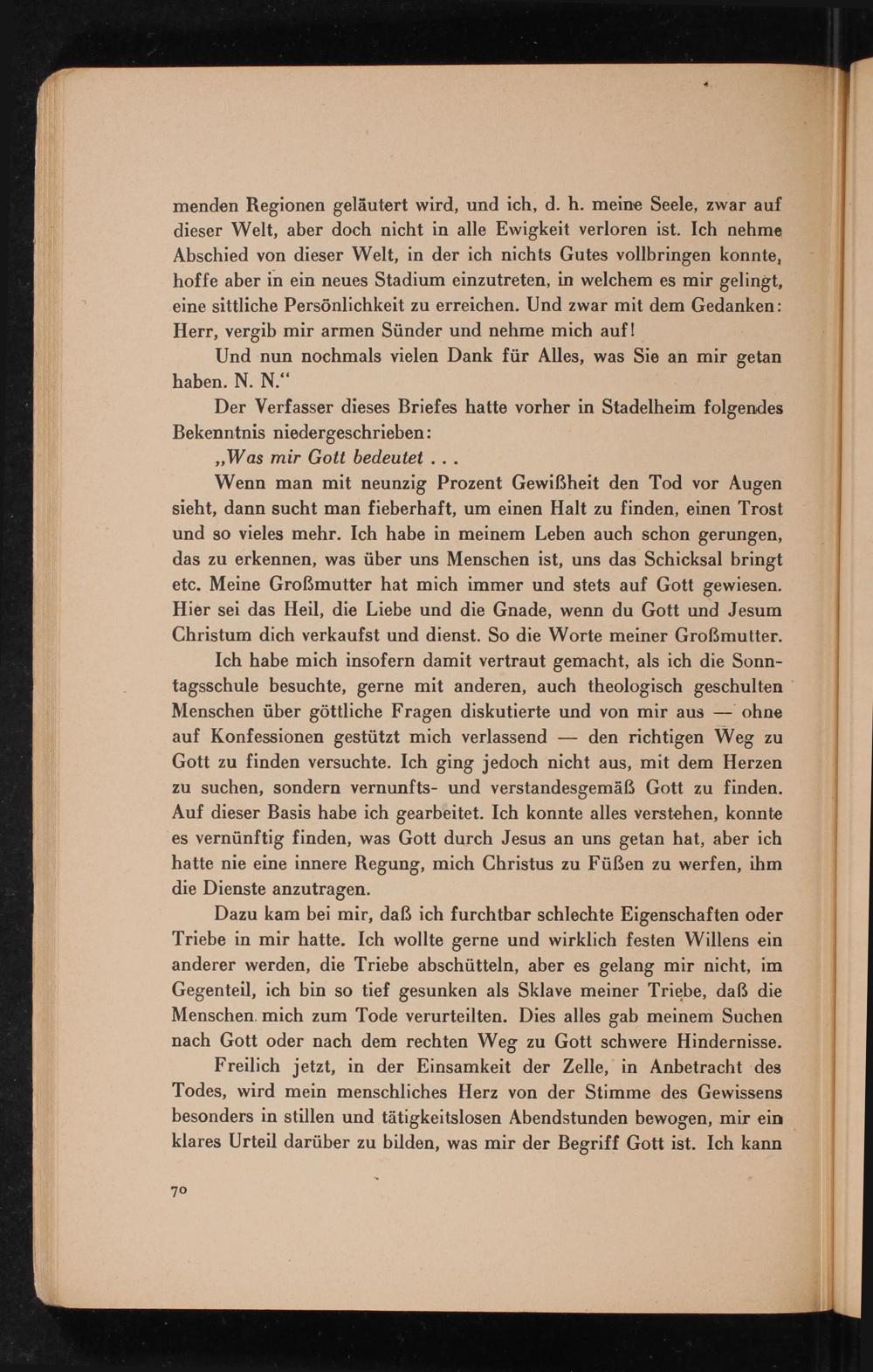 menden Regionen geläutert wird, und ich, d. h. meine Seele, zwar auf dieser Welt, aber doch nicht in alle Ewigkeit verloren ist. Ich nehme Abschied von dieser Welt, in der ich nichts Gutes vollbringen konnte, hoffe aber in ein neues Stadium einzutreten, in welchem es mir gelingt, eine sittliche Persönlichkeit zu erreichen. Und zwar mit dem Gedanken: Herr, vergib mir armen Sünder und nehme mich auf!