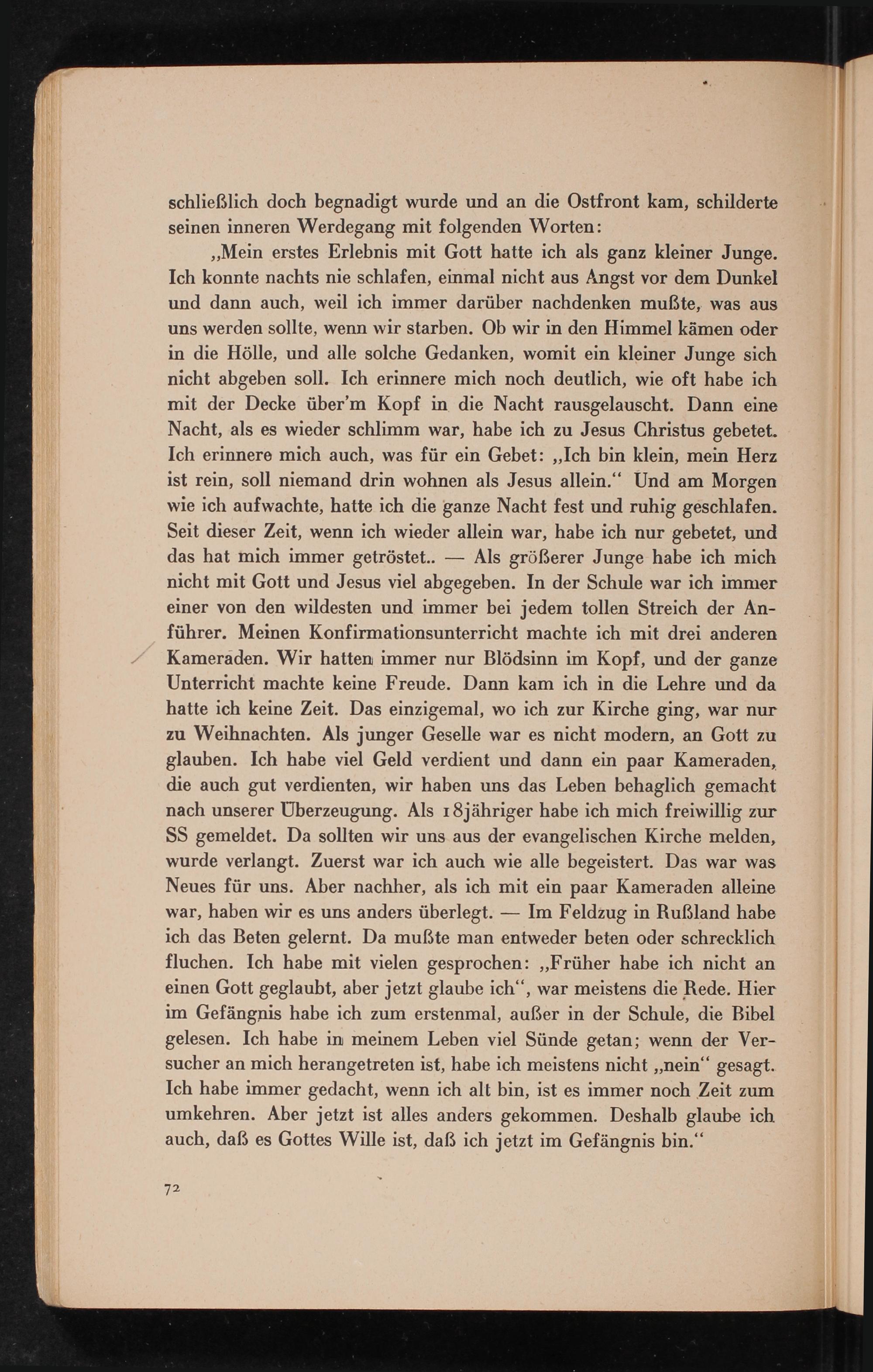 „Mein erstes Erlebnis mit Gott hatte ich als ganz kleiner Junge. Ich konnte nachts nie schlafen, einmal nicht aus Angst vor dem Dunkel und dann auch, weil ich immer darüber nachdenken mußte, was aus uns werden sollte, wenn wir starben. Ob wir in den Himmel kämen oder in die Hölle, und alle solche Gedanken, womit ein kleiner Junge sich nicht abgeben soll. Ich erinnere mich noch deutlich, wie oft habe ich mit der Decke über'm Kopf in die Nacht rausgelauscht. Dann eine Nacht, als es wieder schlimm war, habe ich zu Jesus Christus gebetet. Ich erinnere mich auch, was für ein Gebet:„Ich bin klein, mein Herz ist rein, soll niemand drin wohnen als Jesus allein.“ Und am Morgen wie ich aufwachte, hatte ich die ganze Nacht fest und ruhig geschlafen. Seit dieser Zeit, wenn ich wieder allein war, habe ich nur gebetet, und das hat mich immer getröstet..— Als größerer Junge habe ich mich nicht mit Gott und Jesus viel abgegeben. In der Schule war ich immer einer von den wildesten und immer bei jedem tollen Streich der An- führer. Meinen Konfirmationsunterricht machte ich mit drei anderen Kameraden. Wir hatten immer nur Blödsinn im Kopf, und der ganze Unterricht machte keine Freude. Dann kam ich in die Lehre und da hatte ich keine Zeit. Das einzigemal, wo ich zur Kirche ging, war nur zu Weihnachten. Als junger Geselle war es nicht modern, an Gott zu glauben. Ich habe viel Geld verdient und dann ein paar Kameraden, die auch gut verdienten, wir haben uns das Leben behaglich gemacht nach unserer Überzeugung. Als ı8jähriger habe ich mich freiwillig zur SS gemeldet. Da sollten wir uns aus der evangelischen Kirche melden, wurde verlangt. Zuerst war ich auch wie alle begeistert. Das war was Neues für uns. Aber nachher, als ich mit ein paar Kameraden alleine war, haben wir es uns anders überlegt.— Im Feldzug in Rußland habe ich das Beten gelernt. Da mußte man entweder beten oder schrecklich fluchen. Ich habe mit vielen gesprochen:„Früher habe ich nicht an einen Gott geglaubt, aber jetzt glaube ich‘‘, war meistens die Rede. Hier im Gefängnis habe ich zum erstenmal, außer in der Schule, die Bibel gelesen. Ich habe in meinem Leben viel Sünde getan; wenn der Ver- sucher an mich herangetreten ist, habe ich meistens nicht„nein‘“ gesagt. Ich habe immer gedacht, wenn ich alt bin, ist es immer noch Zeit zum umkehren. Aber jetzt ist alles anders gekommen. Deshalb glaube ich auch, daß es Gottes Wille ist, daß ich jetzt im Gefängnis bin.“