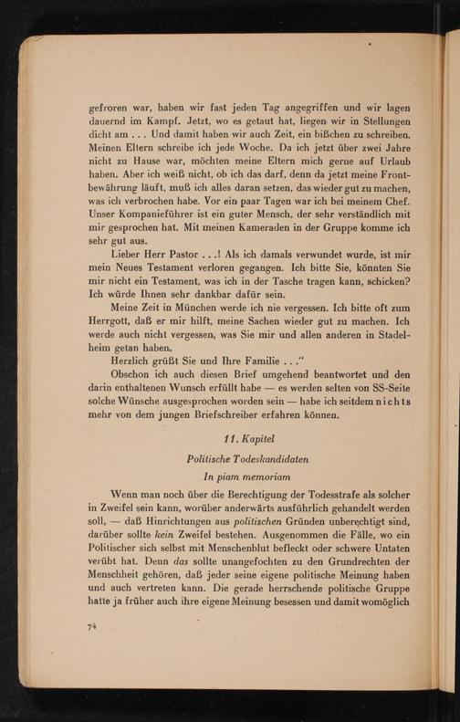 Obschon ich auch diesen Brief umgehend beantwortet und den darin enthaltenen Wunsch erfüllt habe— es werden selten von SS -Seite solche Wünsche ausgesprochen worden sein— habe ich seitdem nichts mehr von dem jungen Briefschreiber erfahren können.