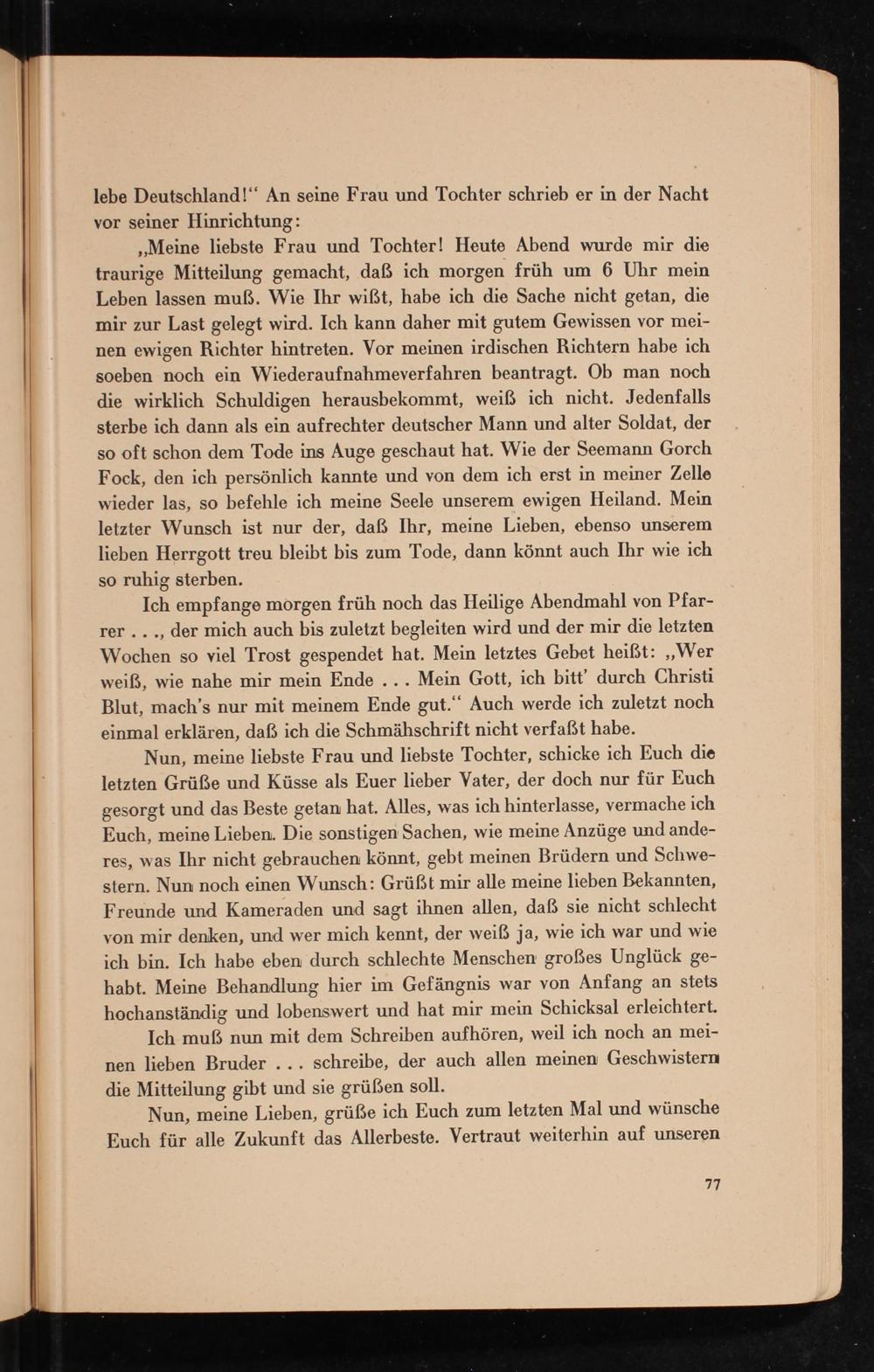 ,, Meine liebste Frau und Tochter! Heute Abend wurde mir die traurige Mitteilung gemacht, daß ich morgen früh um 6 Uhr mein Leben lassen muß. Wie Ihr wißt, habe ich die Sache nicht getan, die mir zur Last gelegt wird. Ich kann daher mit gutem Gewissen vor meinen ewigen Richter hintreten. Vor meinen irdischen Richtern habe ich soeben noch ein Wiederaufnahmeverfahren beantragt. Ob man noch die wirklich Schuldigen herausbekommt, weiß ich nicht. Jedenfalls sterbe ich dann als ein aufrechter deutscher Mann und alter Soldat, der so oft schon dem Tode ins Auge geschaut hat. Wie der Seemann Gorch Fock, den ich persönlich kannte und von dem ich erst in meiner Zelle wieder las, so befehle ich meine Seele unserem ewigen Heiland. Mein letzter Wunsch ist nur der, daß Ihr, meine Lieben, ebenso unserem lieben Herrgott treu bleibt bis zum Tode, dann könnt auch Ihr wie ich so ruhig sterben.
