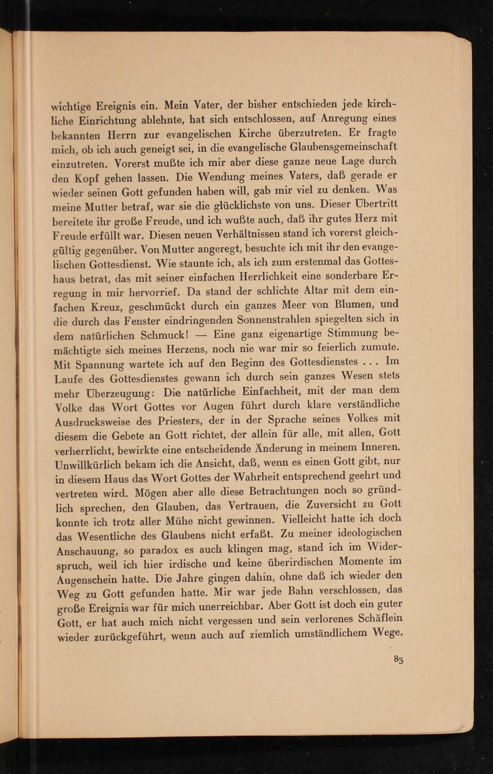 wichtige Ereignis ein. Mein Vater, der bisher entschieden jede kirchliche Einrichtung ablehnte, hat sich entschlossen, auf Anregung eines bekannten Herrn zur evangelischen Kirche überzutreten. Er fragte mich, ob ich auch geneigt sei, in die evangelische Glaubensgemeinschaft einzutreten. Vorerst mußte ich mir aber diese ganze neue Lage durch den Kopf gehen lassen. Die Wendung meines Vaters, daß gerade er wieder seinen Gott gefunden haben will, gab mir viel zu denken. Was meine Mutter betraf, war sie die glücklichste von uns. Dieser Übertritt bereitete ihr große Freude, und ich wußte auch, daß ihr gutes Herz mit Freude erfüllt war. Diesen neuen Verhältnissen stand ich vorerst gleichgültig gegenüber. Von Mutter angeregt, besuchte ich mit ihr den evangelischen Gottesdienst. Wie staunte ich, als ich zum erstenmal das Gotteshaus betrat, das mit seiner einfachen Herrlichkeit eine sonderbare Erregung in mir hervorrief. Da stand der schlichte Altar mit dem einfachen Kreuz, geschmückt durch ein ganzes Meer von Blumen, und die durch das Fenster eindringenden Sonnenstrahlen spiegelten sich in dem natürlichen Schmuck! Eine ganz eigenartige Stimmung bemächtigte sich meines Herzens, noch nie war mir so feierlich zumute. Mit Spannung wartete ich auf den Beginn des Gottesdienstes... Im Laufe des Gottesdienstes gewann ich durch sein ganzes Wesen stets mehr Überzeugung: Die natürliche Einfachheit, mit der man dem Volke das Wort Gottes vor Augen führt durch klare verständliche Ausdrucksweise des Priesters, der in der Sprache seines Volkes mit diesem die Gebete an Gott richtet, der allein für alle, mit allen, Gott verherrlicht, bewirkte eine entscheidende Änderung in meinem Inneren. Unwillkürlich bekam ich die Ansicht, daß, wenn es einen Gott gibt, nur in diesem Haus das Wort Gottes der Wahrheit entsprechend geehrt und vertreten wird. Mögen aber alle diese Betrachtungen noch so gründlich sprechen, den Glauben, das Vertrauen, die Zuversicht zu Gott konnte ich trotz aller Mühe nicht gewinnen. Vielleicht hatte ich doch das Wesentliche des Glaubens nicht erfaßt. Zu meiner ideologischen Anschauung, so paradox es auch klingen mag, stand ich im Widerspruch, weil ich hier irdische und keine überirdischen Momente im Augenschein hatte. Die Jahre gingen dahin, ohne daß ich wieder den Weg zu Gott gefunden hatte. Mir war jede Bahn verschlossen, das große Ereignis war für mich unerreichbar. Aber Gott ist doch ein guter Gott, er hat auch mich nicht vergessen und sein verlorenes Schäflein wieder zurückgeführt, wenn auch auf ziemlich umständlichem Wege.