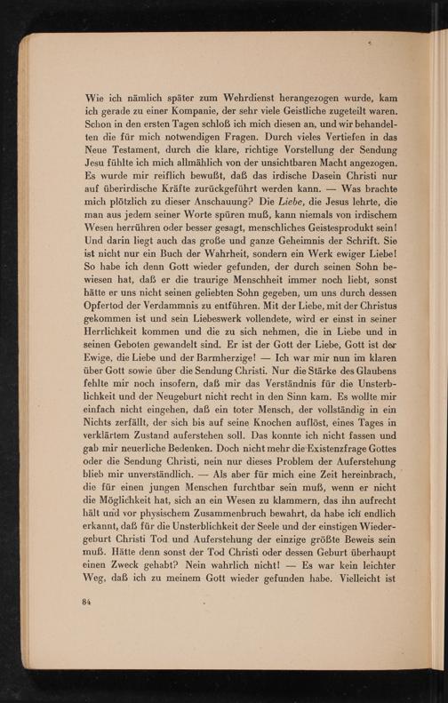 Wie ich nämlich später zum Wehrdienst herangezogen wurde, kam ich gerade zu einer Kompanie, der sehr viele Geistliche zugeteilt waren. Schon in den ersten Tagen schloß ich mich diesen an, und wir behandelten die für mich notwendigen Fragen. Durch vieles Vertiefen in das Neue Testament, durch die klare, richtige Vorstellung der Sendung Jesu fühlte ich mich allmählich von der unsichtbaren Macht angezogen. Es wurde mir reiflich bewußt, daß das irdische Dasein Christi nur auf überirdische Kräfte zurückgeführt werden kann. Was brachte mich plötzlich zu dieser Anschauung? Die Liebe, die Jesus lehrte, die man aus jedem seiner Worte spüren muß, kann niemals von irdischem Wesen herrühren oder besser gesagt, menschliches Geistesprodukt sein! Und darin liegt auch das große und ganze Geheimnis der Schrift. Sie ist nicht nur ein Buch der Wahrheit, sondern ein Werk ewiger Liebe! So habe ich denn Gott wieder gefunden, der durch seinen Sohn bewiesen hat, daß er die traurige Menschheit immer noch liebt, sonst hätte er uns nicht seinen geliebten Sohn gegeben, um uns durch dessen Opfertod der Verdammnis zu entführen. Mit der Liebe, mit der Christus gekommen ist und sein Liebeswerk vollendete, wird er einst in seiner Herrlichkeit kommen und die zu sich nehmen, die in Liebe und in seinen Geboten gewandelt sind. Er ist der Gott der Liebe, Gott ist der Ewige, die Liebe und der Barmherzige! Ich war mir nun im klaren über Gott sowie über die Sendung Christi. Nur die Stärke des Glaubens fehlte mir noch insofern, daß mir das Verständnis für die Unsterblichkeit und der Neugeburt nicht recht in den Sinn kam. Es wollte mir einfach nicht eingehen, daß ein toter Mensch, der vollständig in ein Nichts zerfällt, der sich bis auf seine Knochen auflöst, eines Tages in verklärtem Zustand auferstehen soll. Das konnte ich nicht fassen und gab mir neuerliche Bedenken. Doch nicht mehr die Existenzfrage Gottes oder die Sendung Christi, nein nur dieses Problem der Auferstehung blieb mir unverständlich. Als aber für mich eine Zeit hereinbrach, die für einen jungen Menschen furchtbar sein muß, wenn er nicht die Möglichkeit hat, sich an ein Wesen zu klammern, das ihn aufrecht hält und vor physischem Zusammenbruch bewahrt, da habe ich endlich erkannt, daß für die Unsterblichkeit der Seele und der einstigen Wiedergeburt Christi Tod und Auferstehung der einzige größte Beweis sein muß. Hätte denn sonst der Tod Christi oder dessen Geburt überhaupt einen Zweck gehabt? Nein wahrlich nicht! Es war kein leichter Weg, daß ich zu meinem Gott wieder gefunden habe. Vielleicht ist