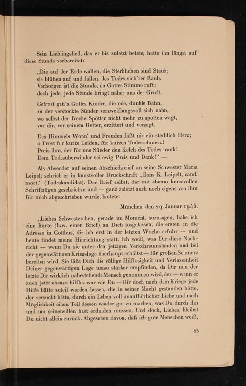 Als Absender auf seinen Abschiedsbrief an seine Schwester Maria Leipelt schrieb er in kunstvoller Druckschrift„Hans K. Leipelt, cand. mort.‘“(Todeskandidat). Der Brief selbst, der mit ebenso kunstvollen Schriftzügen geschrieben und— ganz zuletzt auch noch eigens von ihm für mich abgeschrieben wurde, lautete:
