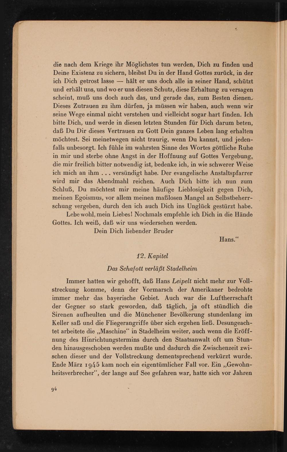die nach dem Kriege ihr Möglichstes tun werden, Dich zu finden und Deine Existenz zu sichern, bleibst Du in der Hand Gottes zurück, in der ich Dich getrost lasse hält er uns doch alle in seiner Hand, schützt und erhält uns, und wo er uns diesen Schutz, diese Erhaltung zu versagen scheint, muß uns doch auch das, und gerade das, zum Besten dienen. Dieses Zutrauen zu ihm dürfen, ja müssen wir haben, auch wenn wir seine Wege einmal nicht verstehen und vielleicht sogar hart finden. Ich bitte Dich, und werde in diesen letzten Stunden für Dich darum beten, daß Du Dir dieses Vertrauen zu Gott Dein ganzes Leben lang erhalten möchtest. Sei meinetwegen nicht traurig, wenn Du kannst, und jedenfalls unbesorgt. Ich fühle im wahrsten Sinne des Wortes göttliche Ruhe in mir und sterbe ohne Angst in der Hoffnung auf Gottes Vergebung, die mir freilich bitter notwendig ist, bedenke ich, in wie schwerer Weise ich mich an ihm... versündigt habe. Der evangelische Anstaltspfarrer wird mir das Abendmahl reichen. Auch Dich bitte ich nun zum Schluß, Du möchtest mir meine häufige Lieblosigkeit gegen Dich, meinen Egoismus, vor allem meinen maßlosen Mangel an Selbstbeherrschung vergeben, durch den ich auch Dich ins Unglück gestürzt habe. Lebe wohl, mein Liebes! Nochmals empfehle ich Dich in die Hände Gottes. Ich weiß, daß wir uns wiedersehen werden.