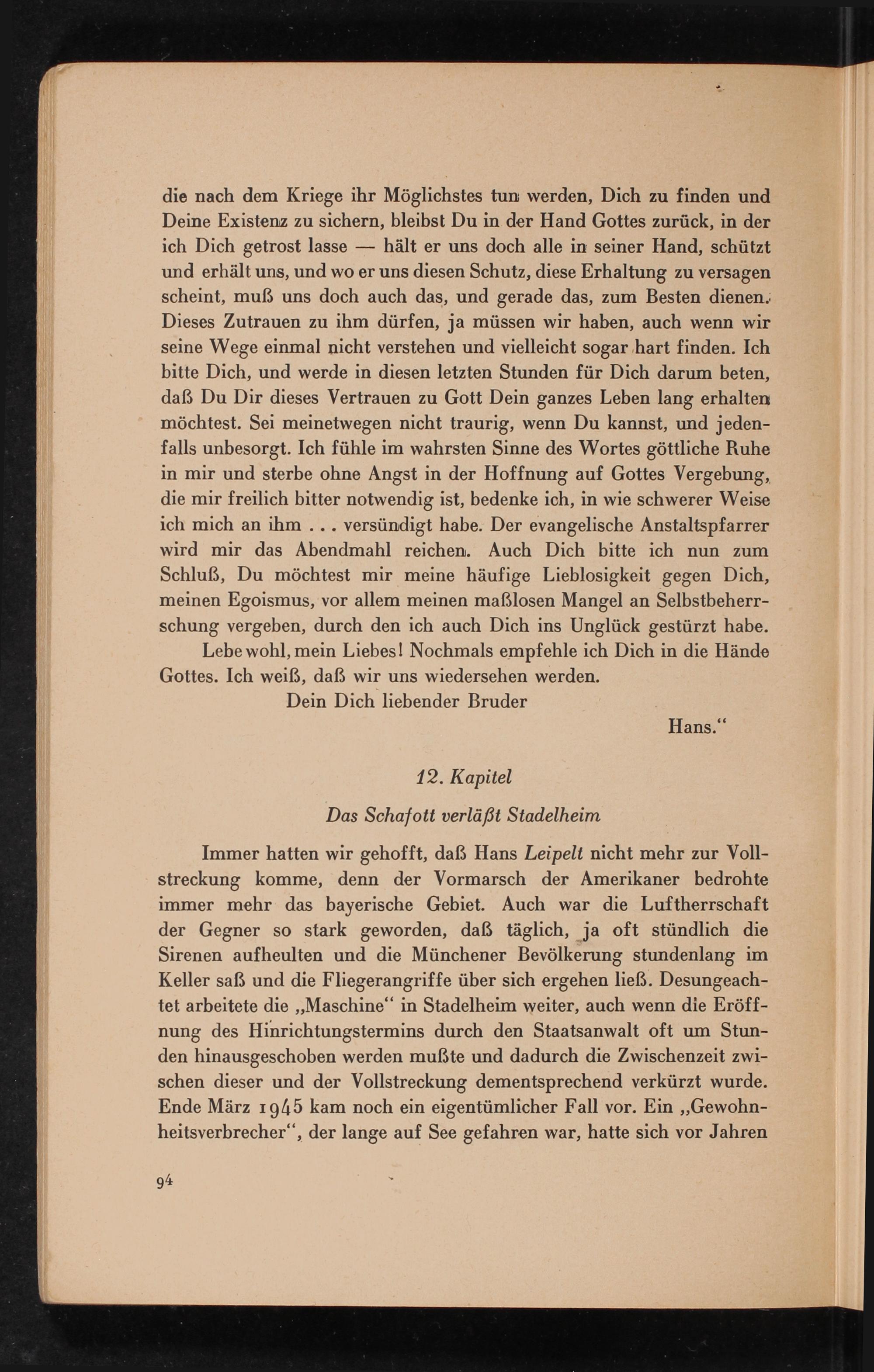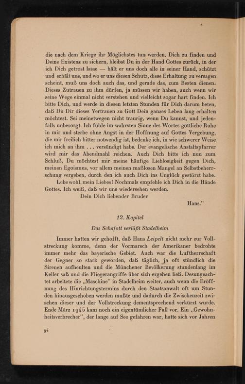 Immer hatten wir gehofft, daß Hans Leipelt nicht mehr zur Vollstreckung komme, denn der Vormarsch der Amerikaner bedrohte immer mehr das bayerische Gebiet. Auch war die Luftherrschaft der Gegner so stark geworden, daß täglich, ja oft stündlich die Sirenen aufheulten und die Münchener Bevölkerung stundenlang im Keller saß und die Fliegerangriffe über sich ergehen ließ. Desungeachtet arbeitete die ,, Maschine" in Stadelheim weiter, auch wenn die Eröffnung des Hinrichtungstermins durch den Staatsanwalt oft um Stunden hinausgeschoben werden mußte und dadurch die Zwischenzeit zwischen dieser und der Vollstreckung dementsprechend verkürzt wurde. Ende März 1945 kam noch ein eigentümlicher Fall vor. Ein ,, Gewohnheitsverbrecher", der lange auf See gefahren war, hatte sich vor Jahren