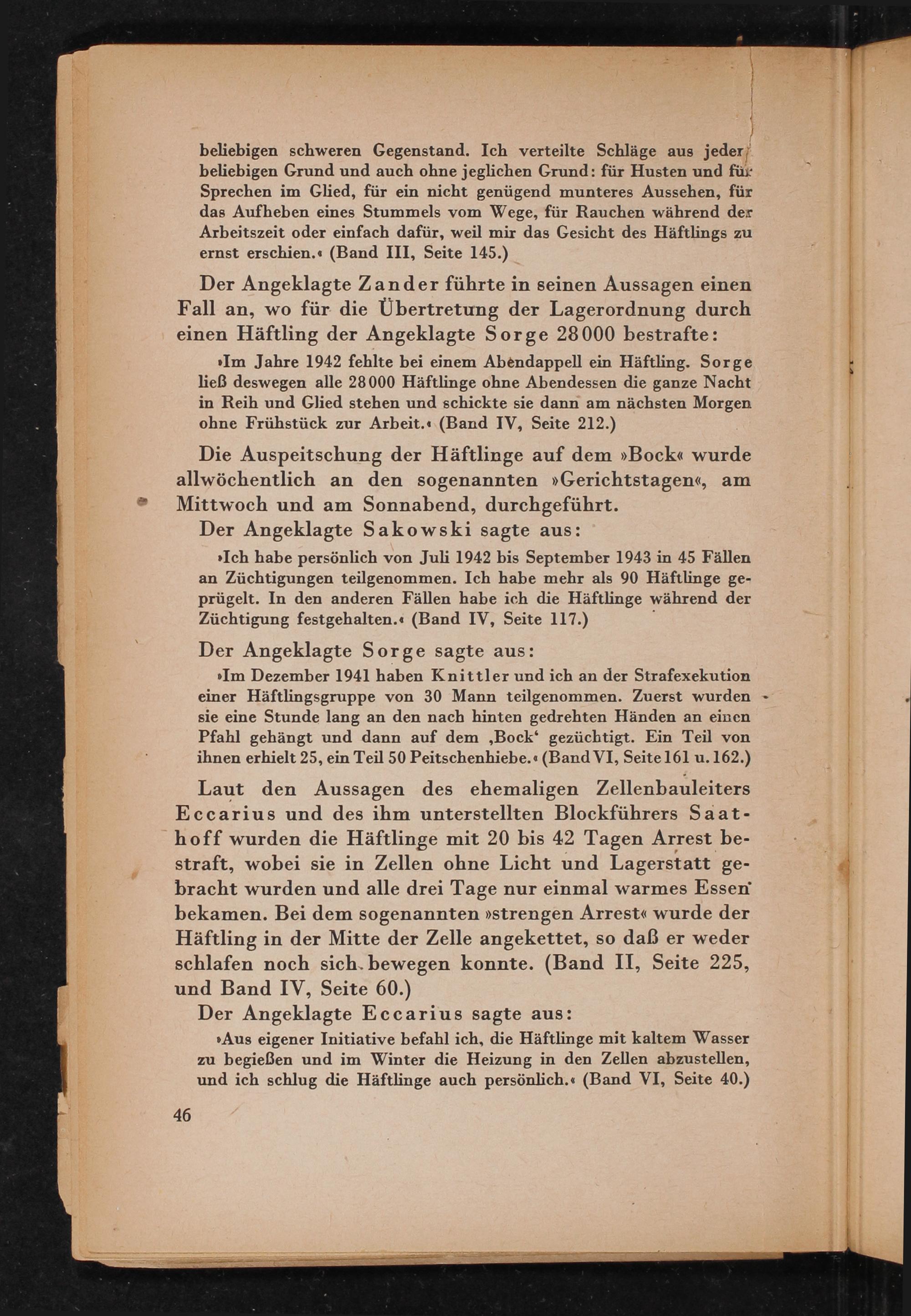 Ich habe persönlich von Juli 1942 bis September 1943 in 45 Fällen an Züchtigungen teilgenommen. Ich habe mehr als 90 Häftlinge geprügelt. In den anderen Fällen habe ich die Häftlinge während der Züchtigung festgehalten.( Band IV, Seite 117.)