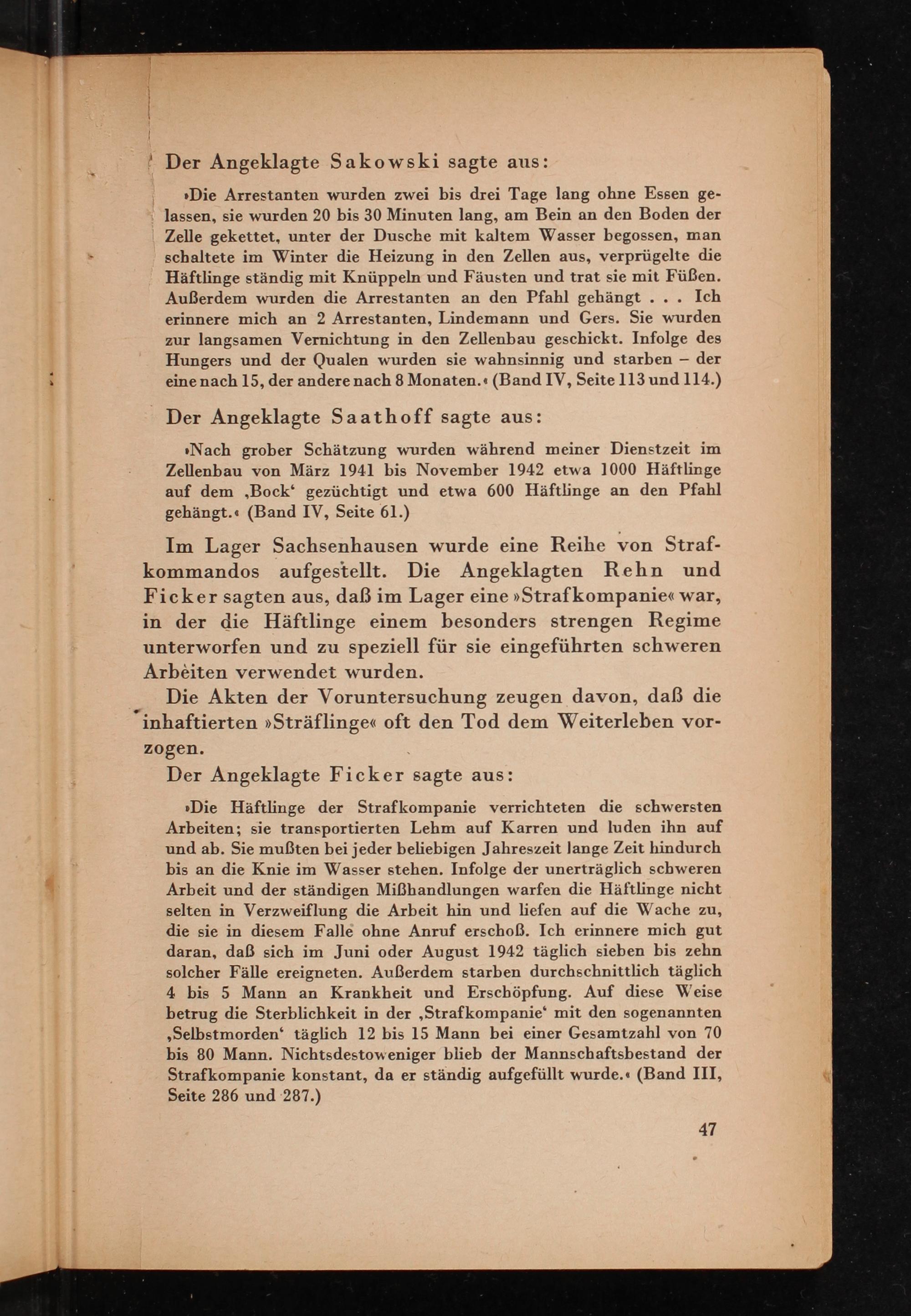 Im Lager Sachsenhausen wurde eine Reihe von Strafkommandos aufgestellt. Die Angeklagten Rehn und Ficker sagten aus, daß im Lager eine» Strafkompanie<< war, in der die Häftlinge einem besonders strengen Regime unterworfen und zu speziell für sie eingeführten schweren Arbeiten verwendet wurden.
