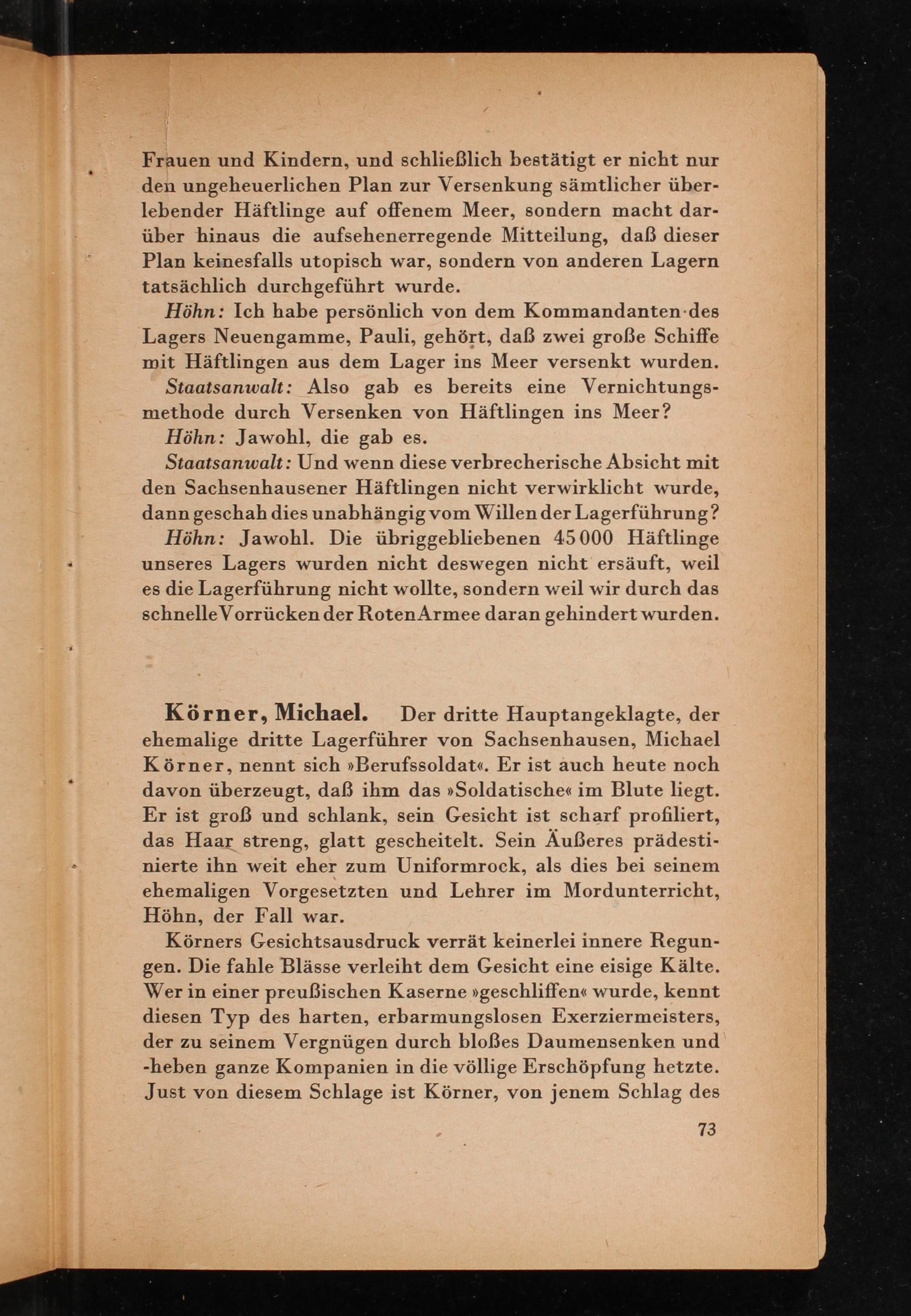Körner, Michael. Der dritte Hauptangeklagte, der ehemalige dritte Lagerführer von Sachsenhausen, Michael Körner, nennt sich» Berufssoldat«. Er ist auch heute noch davon überzeugt, daß ihm das» Soldatische« im Blute liegt. Er ist groß und schlank, sein Gesicht ist scharf profiliert, das Haar streng, glatt gescheitelt. Sein Äußeres prädestinierte ihn weit eher zum Uniformrock, als dies bei seinem ehemaligen Vorgesetzten und Lehrer im Mordunterricht, Höhn, der Fall war.